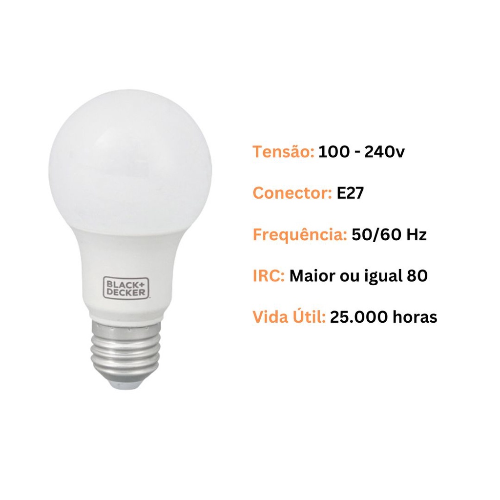 Kit 6 Lâmpada Led Bulbo A60 9W Luz Branca 6500K 1018 lumens Black Decker