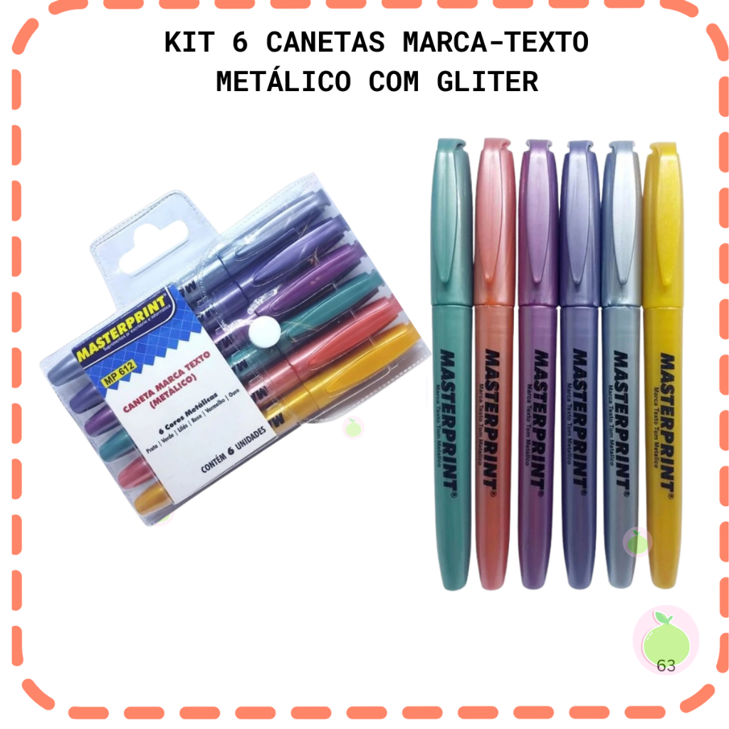 Kit 6 Marca Texto Metálico com Glitter Grifa Texto Estudo Escolar Escritório Universitário Brilhante Masterprint