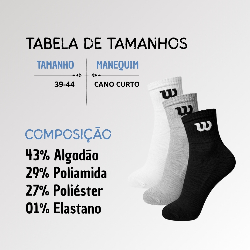 Conforto e desempenho para o seu dia a dia ! O kit de meias cano curto Wilson é ideal para quem busca qualidade, estilo e praticidade. Confeccionadas com material macio e respirável, oferecem ajuste perfeito aos pés, evitando desconfortos. Marca reconhecida no mundo dos esportes ! Contém : 6 pares de meias, sendo pretas, brancas e cinzas. Tamanho : 39 - 44 Escolha Wilson e leve mais performance para sua rotina! Produto 100% original e sem defeitos. ENVIO IMEDIATO.