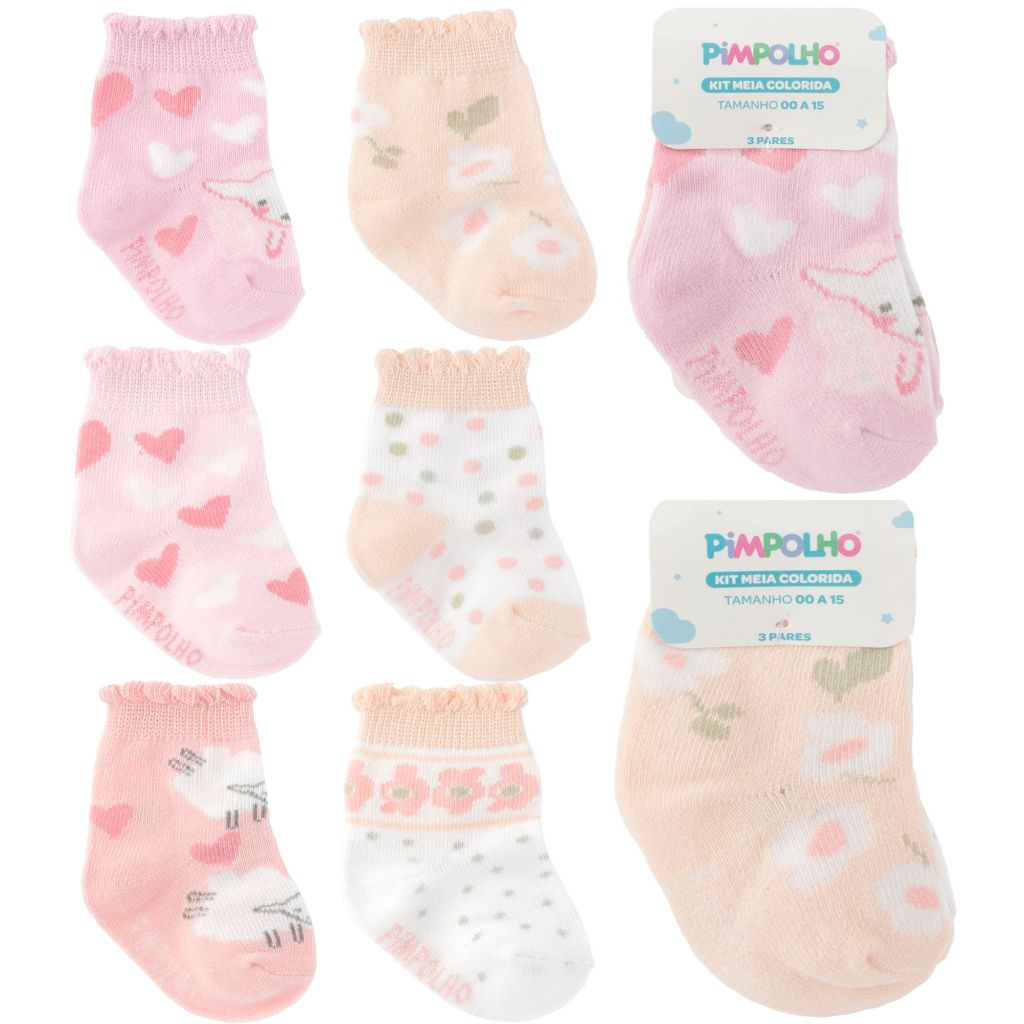 Kit 6 Pares Meia Pimpolho Algodão Antiderrapante Bebê Infantil Feminina Cano Alto Menina Recém Nascido RN 1 Ano