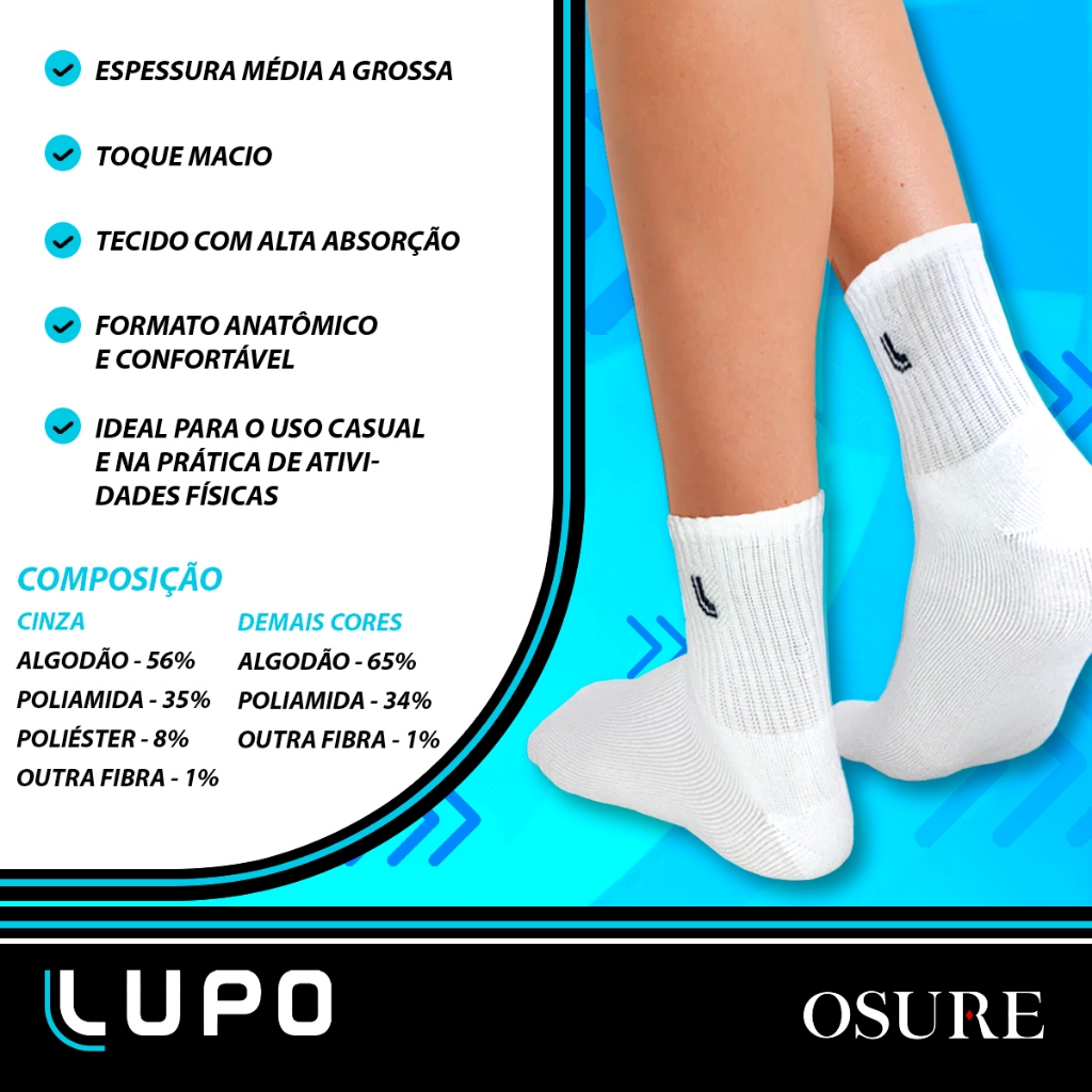 ITENS INCLUSOS: - 6 Meias Originais Lupo Cano Médio Sport Algodão - Ref: 3245 Produto 100% original, com garantia e nota fiscal. DESCRIÇÃO DO PRODUTO: A Meia Lupo Cano Médio é ideal para quem busca durabilidade e bem-estar no dia a dia ou na prática esportiva, além de garantir conforto e qualidade. Fabricadas com materiais de alta qualidade, essas meias oferecem um ajuste perfeito aos pés, proporcionando maior resistência e maciez. CARACTERISTICAS: - Calcanhar Verdadeiro. - Atoalhada - Felpa de proteção na sola / regiões de maior impacto. - Excelente custo benefício na compra do kit. - Punho canelado. - Conforto e durabilidade. TAMANHOS: COMPOSIÇÃO: - 65% Algodão - 34% Poliamida - 1% Outra Fibra POSTAGEM: Se o pagamento for confirmado até as 11:00, postamos o pedido no mesmo dia. Exceto Sábados, Domingos e Feriados. INSTITUCIONAL: Há mais de 10 anos no mercado oferecendo a melhor experiência, a Osure é líder de vendas nos marketplaces e continua crescendo mês a mês, sempre prestando um bom atendimento a um preço justo. São mais de 2 milhões de pedidos e clientes bem atendidos. Trabalhamos somente com produtos originais e priorizamos a agilidade na entrega do produto e qualidade no atendimento, visando proporcionar a melhor experiência possível para nossos clientes.