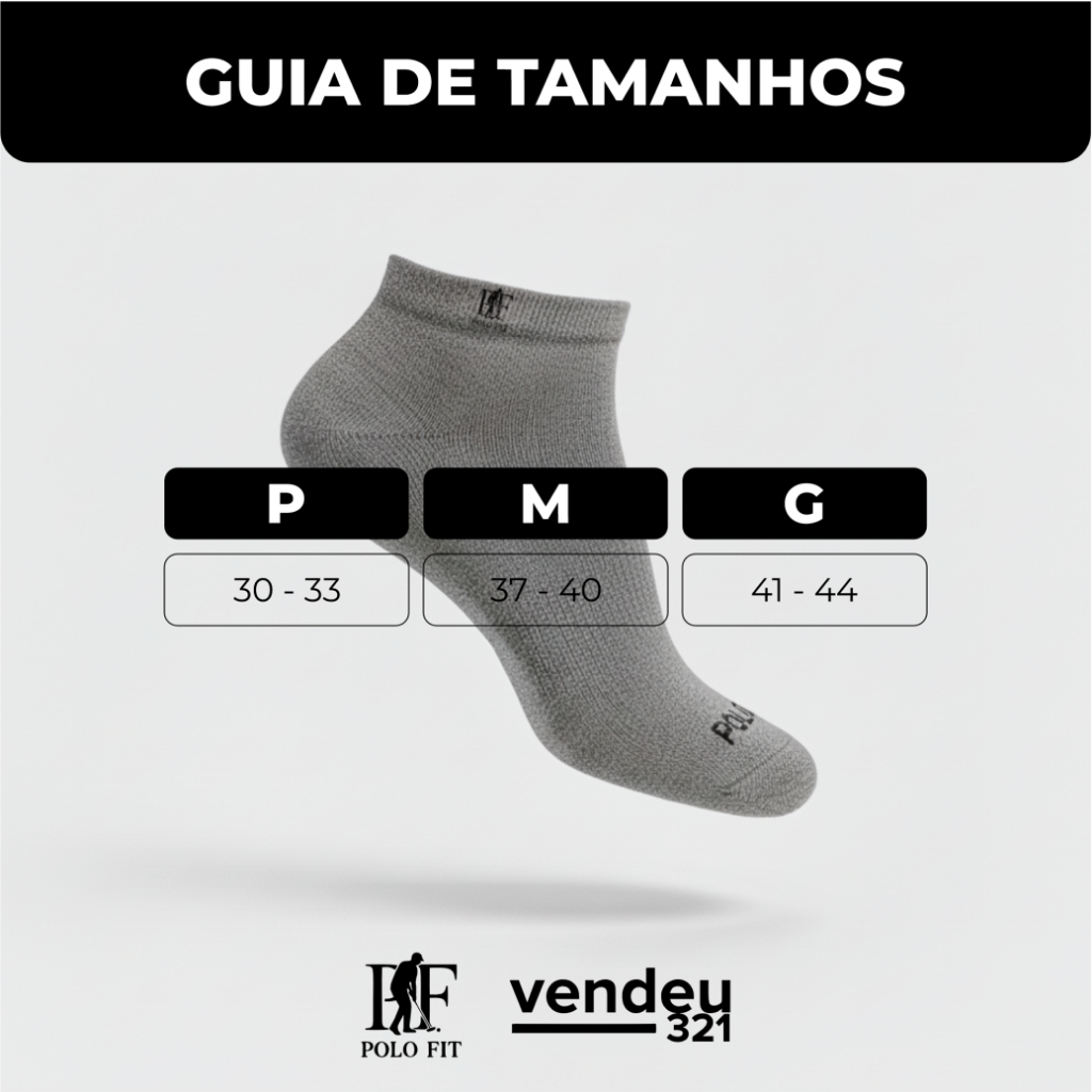 ATENÇÃO: Escolha exatamente o tamanho e a cor que deseja e adicione ao carrinho. ITENS INCLUSOS: - Kit com 6 Pares Meias Soquete - Produto original, com garantia e nota fiscal. DESCRIÇÃO: Confeccionada em algodão super macio e respirável, essa meia oferece conforto extremo, leveza e estilo no seu dia a dia. O tecido permite ventilação, ajudando a evitar odores. O modelo de cano baixo conta com punho soft para um ajuste perfeito, além de possuir silicone no calcanhar, que impede que a meia escorregue dos pés. Ideal para quem busca suavidade, segurança e bem-estar durante todo o dia. - Marca das meias Polo Fit TAMANHOS: M - 33 a 38 G - 39 a 43 COMPOSIÇÃO: 75% Algodão 22% Poliéster 2% Elastano 1% Elastodieno