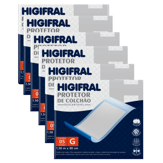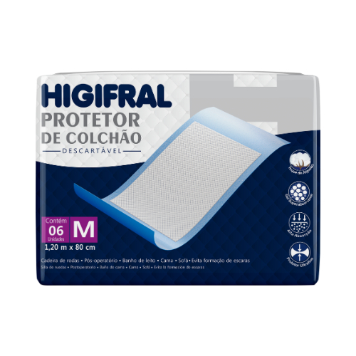 Protetor de Colchão Higifral Tamanho G - 1,50 m x 80 cm Protetor de Colchão Higifral Tamanho M - 1,20 m x 80 cm 📝 Descrição: O protetor de colchão Higifral é a escolha ideal para quem deseja manter o colchão sempre limpo, seco e protegido. Com barreira 100% impermeável, ele evita que líquidos como urina, suor e outros fluídos corporais atinjam a superfície do colchão, sendo indispensável para o cuidado com idosos, acamados, pessoas com incontinência urinária ou em recuperação pós-cirúrgica. Evite odores, manchas e proliferação de fungos com um produto que une eficiência e praticidade. ✅ Benefícios: Impermeavel Conforto Extremo Camada Superior Suave ao Toque Não Causa Ruído ao se movimentar na Cama Uso versátil Pode ser usado na Cama, sofá, cadeira de rodas ou qualquer superfície que precise de proteção 📦 Itens inclusos: Selecione a Variação M OU G 6x Variação M 6un Variação G 5un