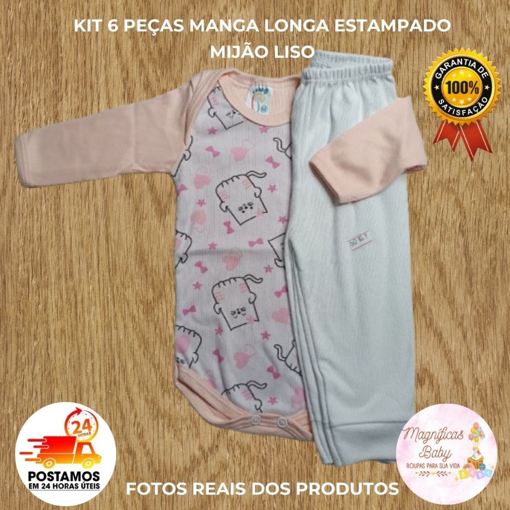 LEIA TODA A DESCRIÇÃO. 💖 kit 6 peças Conjunto Body Manga Longa estampado ( ATENÇÃO pode ir o Body estampado na frente e costa cor lisa) + Mijão cor lisa, maciez e conforto que seu bebê vai amar desde o primeiro toque! 👶✨ 🎯 Perfeito para todos os momentos do seu bebê, este conjunto combina estilo, conforto e praticidade em um só! 🌟 💡 Por que comprar o nosso kit 6 peças ? Porque você quer o melhor para seu bebê sem abrir mão da economia! 💝 Imagine seu bebê confortável o dia todo, seja nas sonecas, nas brincadeiras ou nos passeios. O tecido respirável mantém a pele fresca, evitando desconfortos, e a modelagem facilita a troca, poupando seu tempo em cada troca. Com cores delicadas e fofas, cada momento vai se tornar uma recordação preciosa, cheio de carinho e bem-estar. Porque nada é mais importante do que ver seu bebê sorrindo e seguro! 🌈 🛒 Compre agora e transforme o dia a dia do seu bebê em puro conforto e alegria! 🎯 Compra certa e segura, nossos conjuntos são revisados antes do envio. Aproveite enquanto dura nossa promoção nesse preço imperdível 🌼 TABELA DE MEDIDAS: Se atente ao tamanho do seu bebê, para escolher o melhor tamanho. Tamanho RN - Recém-nascidos Body: 17cm Largura (ombro a ombro) 29cm comprimento Mijão: Altura 35cm x 16cm Largura Tamanho P 1 a 2 meses Body: 18cm Largura (ombro a ombro) 32 comprimento Mijão: Altura 37cm x 18cm Largura Tamanho M 3 a 4 meses Body : 19cm Largura (ombro a ombro) 34 comprimento Mijão: Altura 38cm x 19cm Largura Tamanho G de 5 a 6 meses Body: 20cm Largura (ombro a ombro) 37cm comprimento Mijão: Altura 40cm x 20cm Largura AS CORES E ESTAMPAS podem ir variadas desde que respeitando as categorias, Menino, Menina. Cores: Azul, Rosa, Verde, Amarelo, Creme e Branco Eventualmente pode haver pequena diferença no tom dos conjuntos, pois depende do lote do tecido. 🚰Modo de Lavagem: Para uma maior durabilidade ✅Lavar delicadamente sem uso de alvejante ✅Não usar secadora ✅Não deixar de molho pois corre o risco de manchar ✅Passar a ferro em temperatura baixa Estamos à disposição para qualquer dúvida. Atenciosamente. Equipe Magníficas Baby.