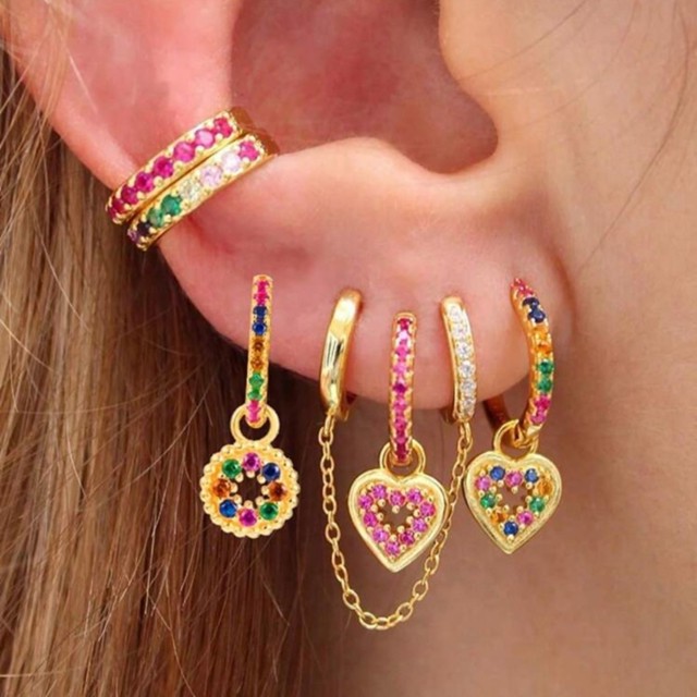 Kit 6 peças de brincos com pingente de coração de zircônia cúbica colorida de alta qualidade para mulheres