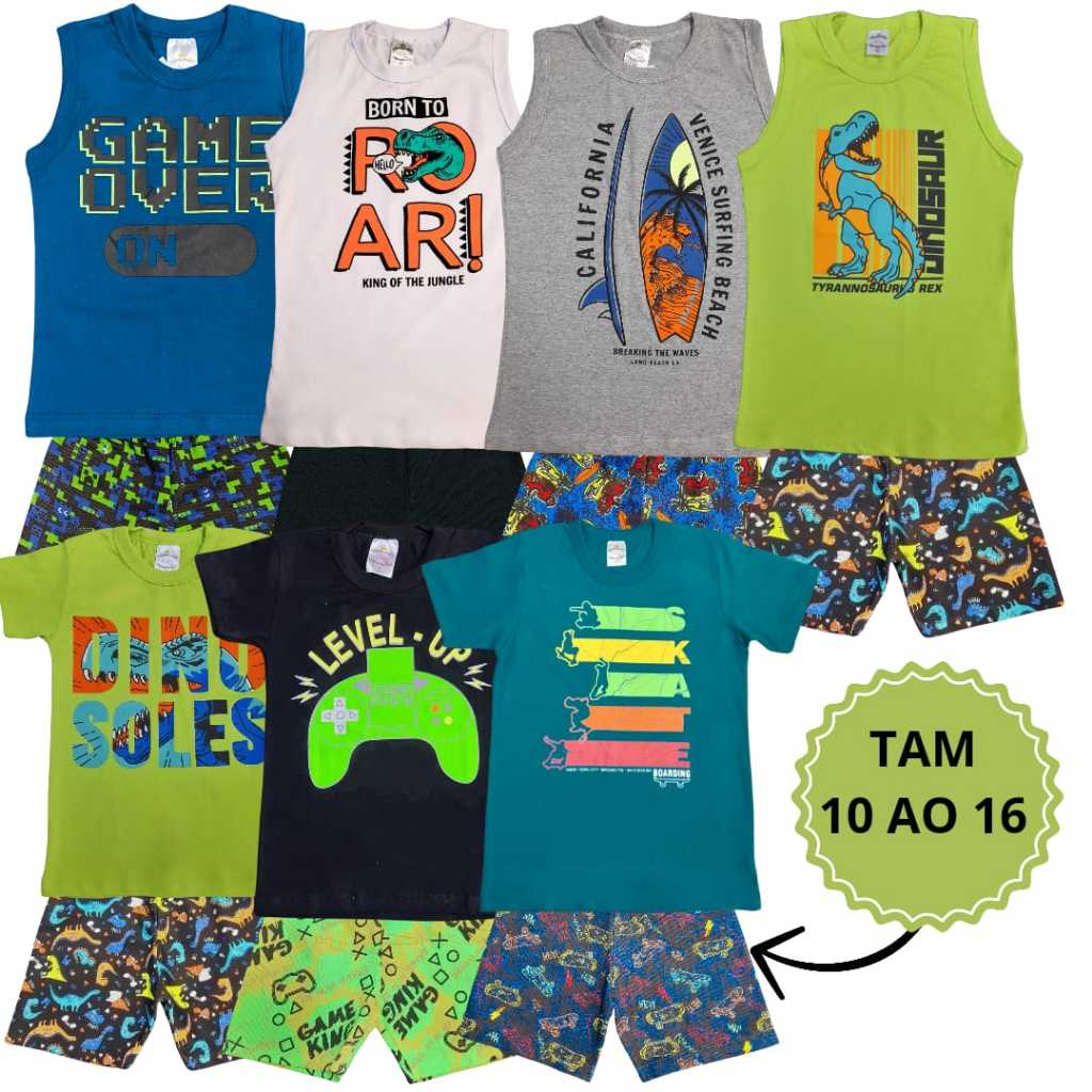 Kit com 6 Peças Infantil 3 Camiseta ou Regata + 3 Bermudinha de Moletinho Lisa ou Estampada KIT COMPOSTO POR: 3 CAMISETA MANGA CURTA OU REGATA 3 BERMUDINHA LISA OU ESTAMPADA ✅Detalhes do produto: - Composição Regata ou Camiseta: 100% Algodão | - Composição Bermudinha: 85% Poliester | - Nossas peças não são transparentes. - As cores e estampas serão envidas sortidas conforme a disponibilidade do estoque. ✅Tabela de Medidas | Camiseta ou Regata: - Tam.: 10 >Larg.: 34cm/ Compr.: 50cm - Tam.: 12 >Larg.: 36cm/ Compr.: 52cm - Tam.: 14 >Larg.: 37cm/ Compr.: 53cm - Tam.: 16 >Larg.: 39cm/ Compr.: 56cm ✅Tabela de Medidas | Bermudinha: - Tam.: 10 >Cint.: 24cm/ Compr.: 34cm - Tam.: 12 >Cint.: 25cm/ Compr.: 36cm - Tam.: 14 >Cint.: 25cm/ Compr.: 38cm - Tam.: 16 >Cint.: 27cm/ Compr.: 40cm ✅Atenção! - Os conjuntos são enviados de forma aleatória, de acordo com a disponibilidade do estoque. - As medidas acima são aproximadas, podendo haver alterações de 2cm para mais ou para menos. ✅Cuidados: - Não alvejar - Não lavar a seco - Não secar em tambor - Secar pendurado e à sombra - Usar ferro em temperatura mínima - Lavar em temperatura máxima de 20ºC 🟨Qualquer dúvida pode nos chamar no chat! 🚚Envio Super Rápido!