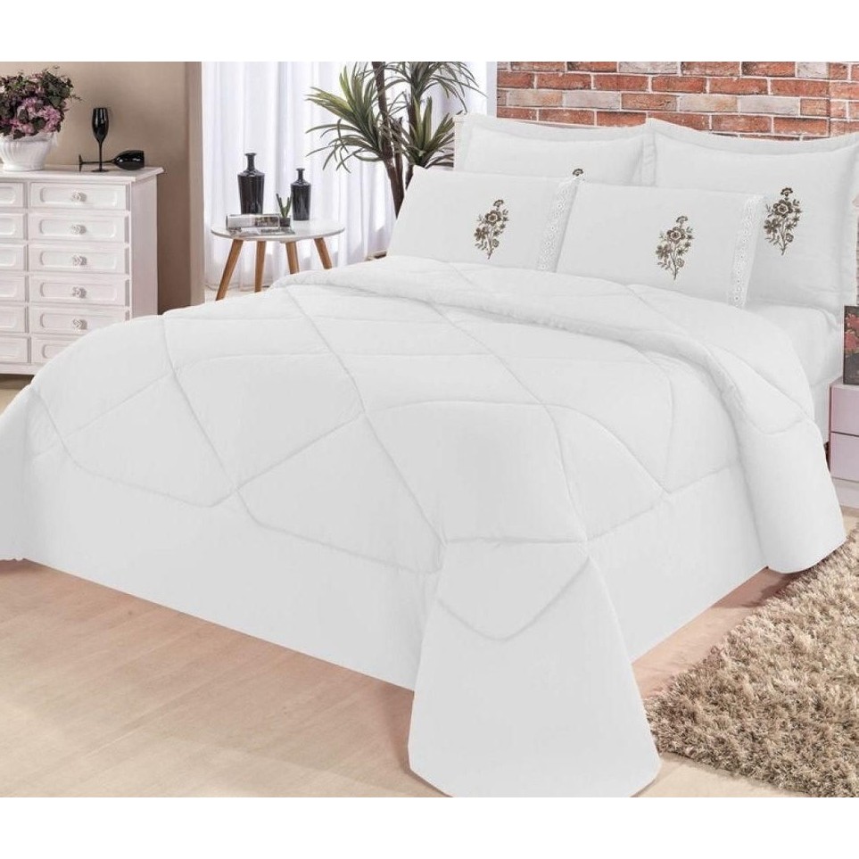Contém: 01 Edredon casal Queen 2,50m x 2,20m 02 porta travesseiro 70cm x 50cm 02 fronhas 50cm x 70cm 01 lençol com elástico 2,50cm x 30cm Composição do edredom Tecido superior microfibra 100% poliéster Enchimento 100% poliéster