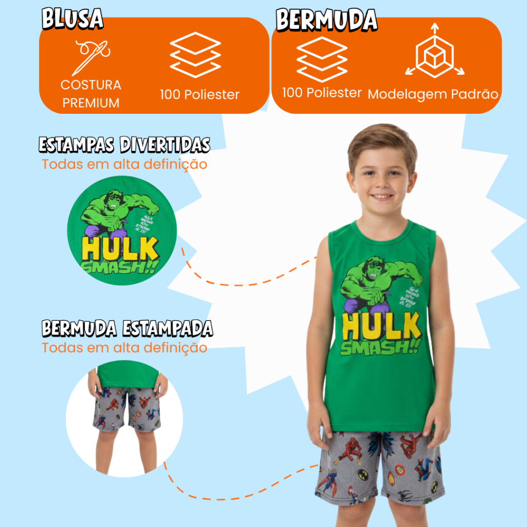 Kit 6 Peças SUPER HERÓIS 3 regatas e 3 bermudas.Obs:Informação na descrição.