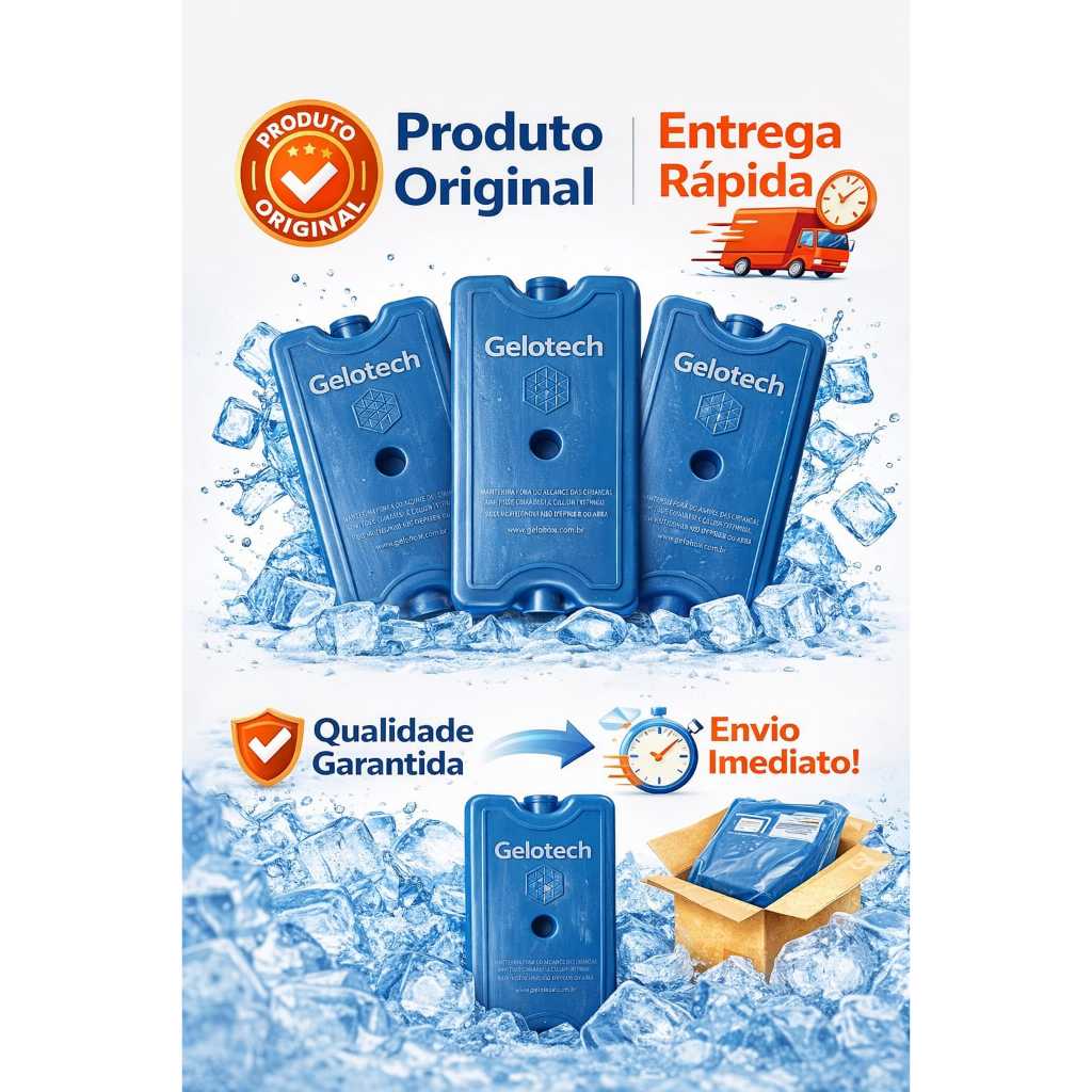 Gelo Reutilizável Gelotech – Alta Eficiência Térmica O gelo reutilizável Gelotech é ideal para manter bebidas, alimentos e medicamentos gelados por muito mais tempo. Perfeito para uso em caixas térmicas, delivery, transporte de alimentos, pescarias, viagens e camping. Fabricado com material resistente e gel térmico de alta performance, garantindo maior durabilidade e eficiência no resfriamento. * Os gelos rígidos devem ser armazenados entre -15°C e -25°C por no mínimo 72 horas, considerar a contagem das 72h após seu equipamento atingir a faixa de trabalho (-15 à -25°C), para que ocorra congelamento de toda área do frasco. * Devem ser acomodados na posição vertical e com espaçamento entre eles com a finalidade de facilitar a circulação de ar e para não danificar as paredes do freezer, devido à pressão exercida pelo aumento de volume do gel no processo de congelamento. * Usar apenas para o fim a que se destina. * O produto não é tóxico, é 100% reciclado e não agride o meio ambiente. * Os procedimentos de descartes convencionais não oferecem riscos ambientais; por ser um produto atóxico e de material reciclado, não causam danos ao meio ambiente. O gel pode ser descartado na rede de esgoto e o frasco encaminhado para reciclagem