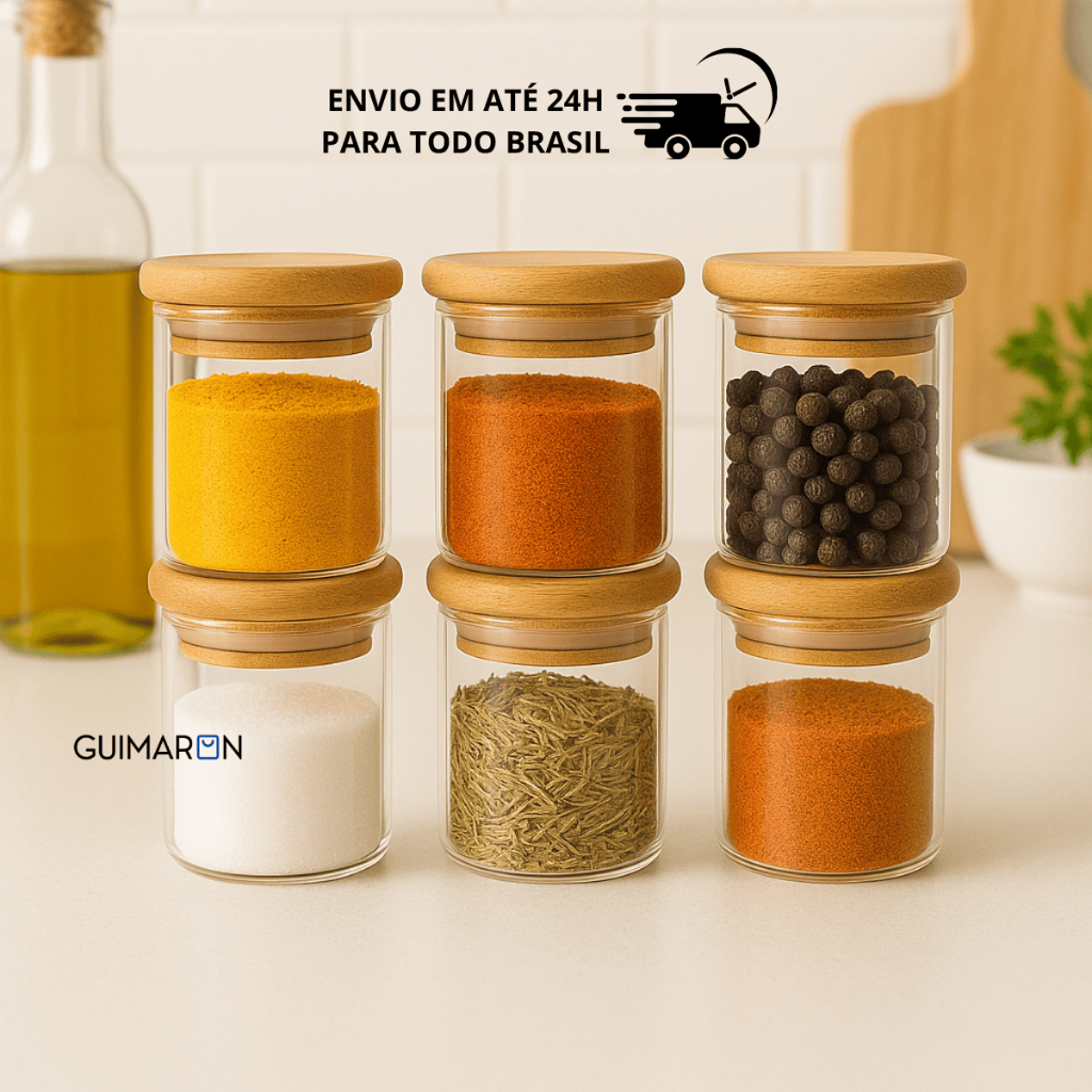 | Kit 6 Potes de Vidro 200ml com Tampa de Bambu Hermético Mantimentos... este produto | R$ 29,80 | 40% | 4.9/5 | 153 |