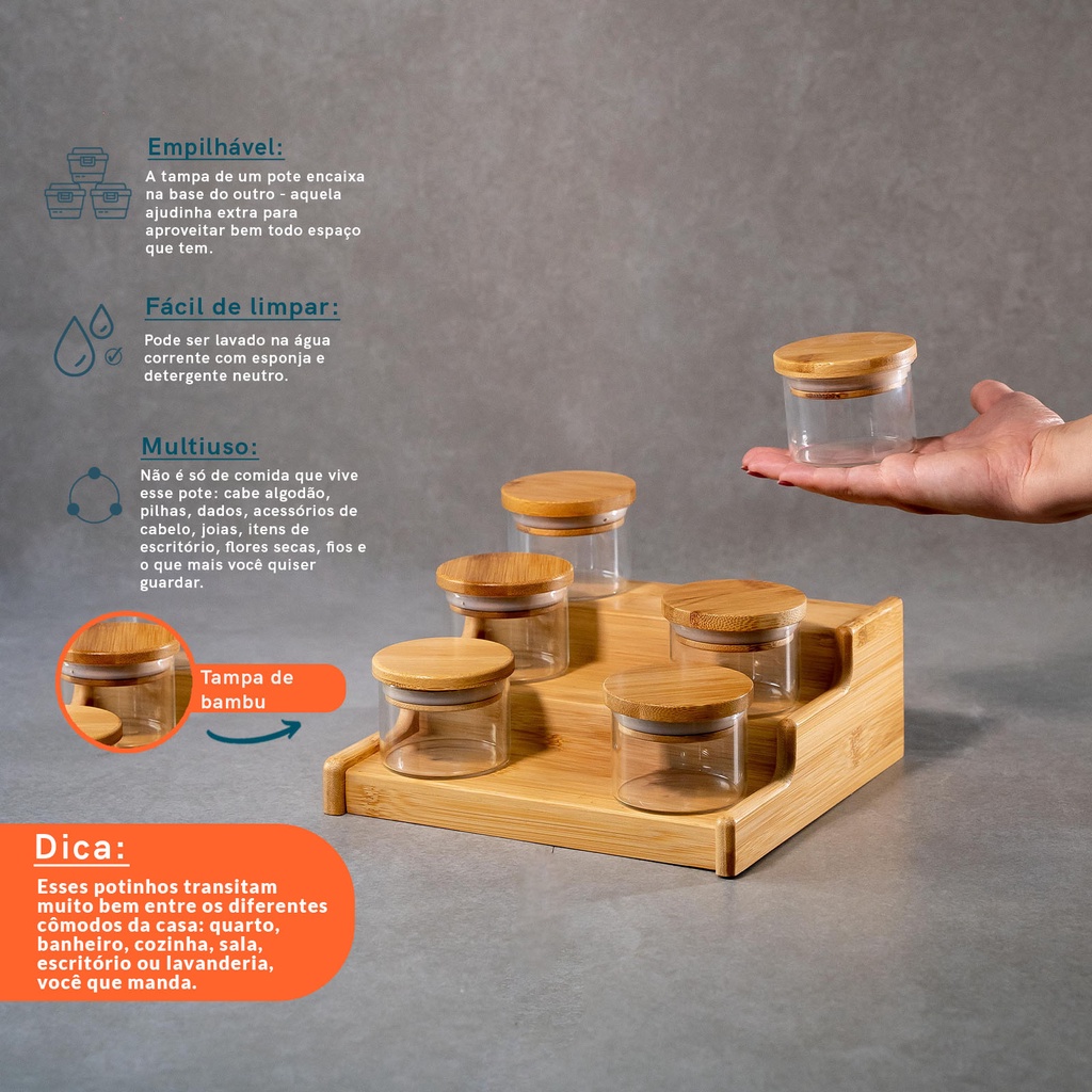 Kit 6 potes de vidro herméticos 110ml com tampa de bambu e rack organizador de bambu - Oikos