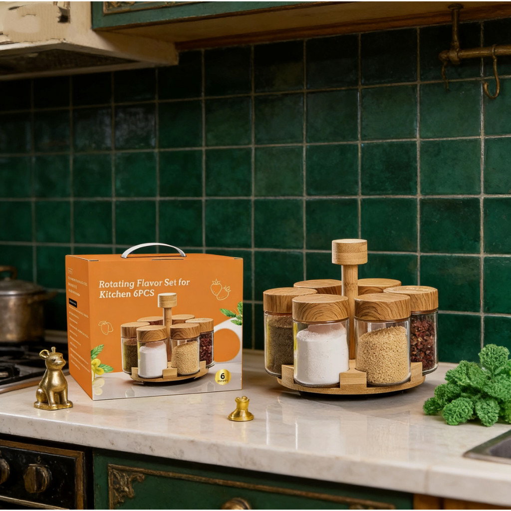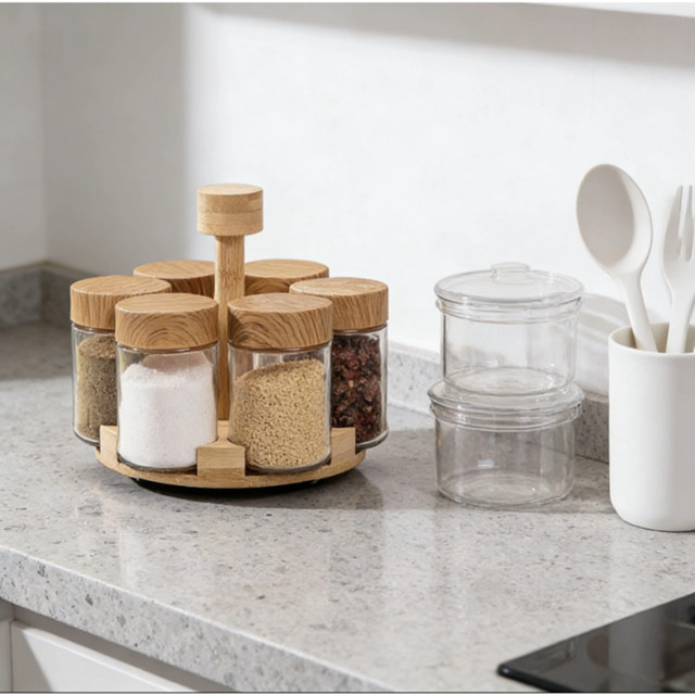 Kit 6 Potes De Vidro Porta Tempero Condimentos Com Suporte E Tampa Em Bambu Suporte Giratorio