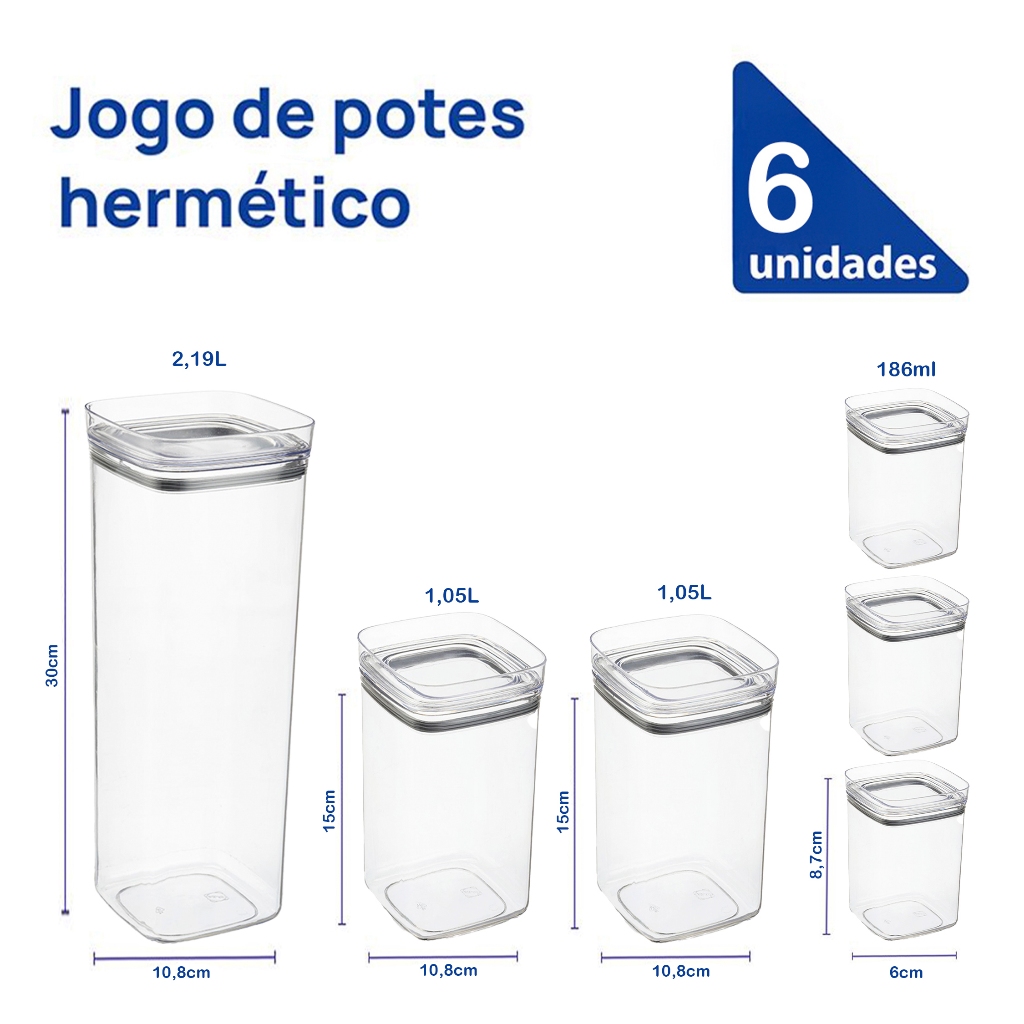 Kit 6 Potes Herméticos Quadrado Empilháveis Multiuso Porta Mantimentos Tamanhos Variados 9061 Arthi