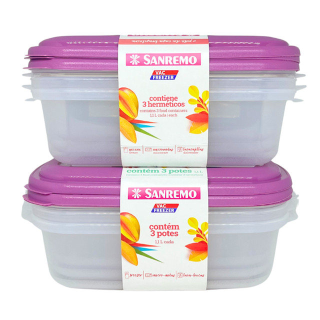 | Kit 6 Potes Pástico Retangulares Resistente Micro-Ondas 1,1L Sanremo este produto | R$ 55,90 | 21% | 4.9/5 | 14 |