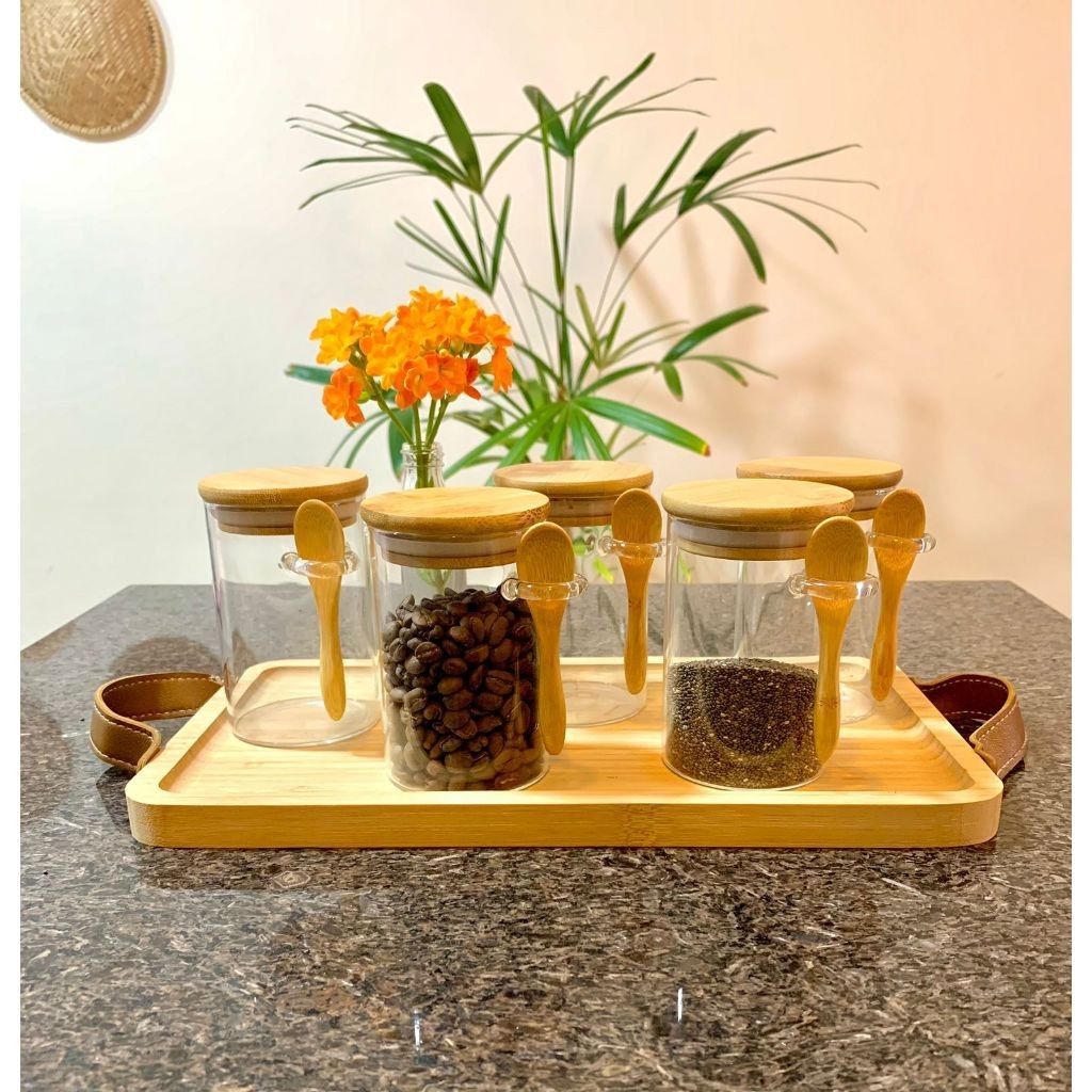 Kit 6 Potes Vidro 245ml Tampa Hermética De Bambu +6 Colher