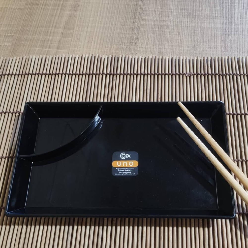 Kit 6 Pratos para Sushi Comida Japonesa Oriental com Porta Shoyu Preto Uno Coza Garantia: 90 dias / Peso: 564g / Cor predominante: Preto / Ref: 7798138183933 Dimensões de cada prato: 19,5cm (C) x 11,2cm (L) x 2,5cm (A); Material: Polipropileno; Possui compartimento para molho shoyu; Conteúdo: 6 pratos. Cuidados: - Suporta temperaturas de -10 a 80°C; - Lavar com esponja macia e sabão neutro; - Não usar produtos abrasivos; - Pode ir à lava-louças. A linha Uno foi criada pensando nos pratos da culinária oriental. Esse conjunto de pratos para comida japonesa possui compartimento para molho shoyu, tornando-o ainda mais funcional. O design sofisticado surpreenderá seus convidados, além de trazer um diferencial à sua mesa posta. Este kit de 6 pratos para comida oriental é de fácil limpeza, pois seu material é resistente e compatível com lava-louças. Tenha qualidade e sofisticação ao servir com esse prato para sushi.