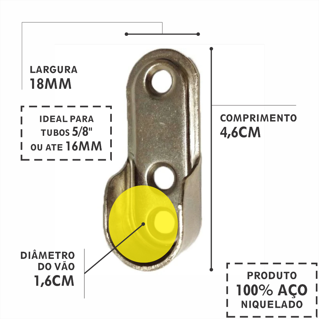Kit contendo 6 suportes de aço para tubos com formato oblongo com 16mm de largura ou redondo com 5/8" de diâmetro. Os suportes para as barras podem ser fixados com o uso de buchas ou de rebites, de acordo com a superfície em que serão instalados. Não acompanha parafusos, rebites ou buchas. INFORMAÇÕES TÉCNICAS Tipo: Suportes para tubo oblongo Material: Aço Conteúdo da embalagem: 6 Suportes para tubo