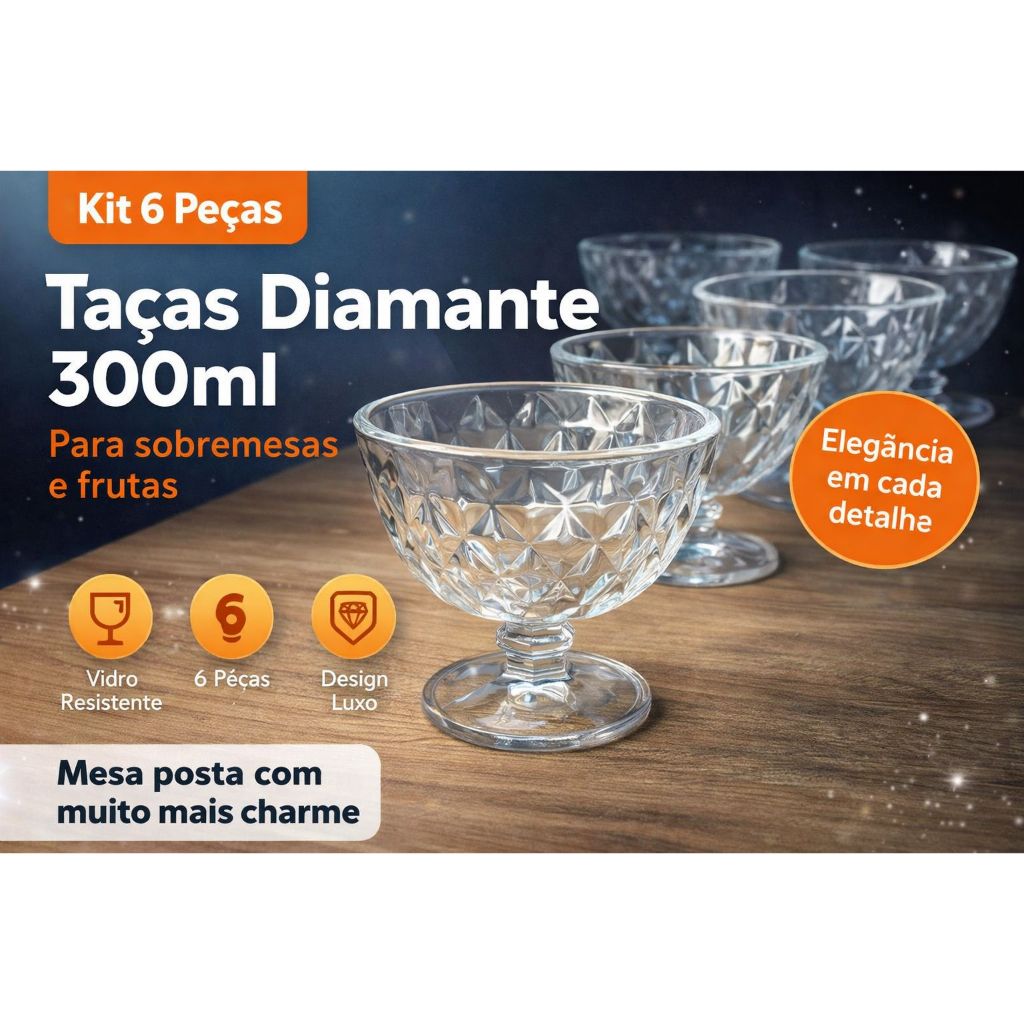 KIT 6 Taças de Sobremesa em Vidro Diamond Diamante Luxo para Sorvete, Doces e Frutas 240 ml fratelli.