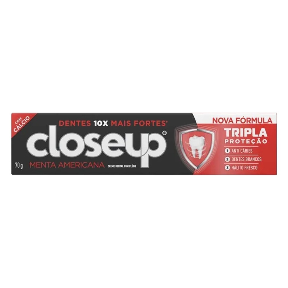 Kit 6 und Creme Dental Close Up Triple Menta Americana 70g Close Up Triple foi formulada com cálcio e flúor bioativo, proporcionando dentes fortes, brancos e hálito fresco. Experimente o gosto suave e fresco da Menta Americana. Sobre o Produto A fórmula do creme dental Triple promove uma limpeza profunda e eficaz proporcionando dentes fortes, brancos e hálito fresco e duradouro Sua fórmula possui flúor bioativo e cálcio O flúor bioativo ajuda no combate às cáries O cálcio ajuda a fortalecer os dentes Ajuda também na remoção de manchas da superfície dos dentes, deixando-os mais brancos.