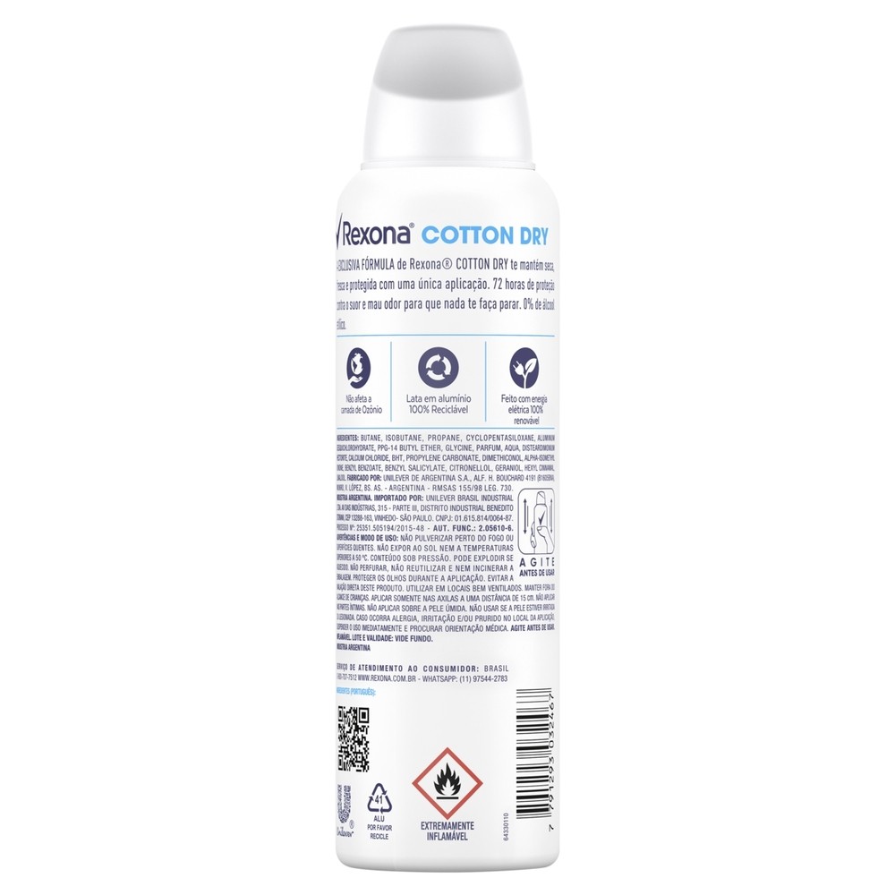 Kit 6 und Desod Aero Rexona Feminino Cotton Dry 150mlO Desodorante Antitranspirante Aerosol Feminino Rexona Cotton Dry possui nova fórmula com 72 horas de proteção contra a transpiração e o mau odor para que nada faça te pararFórmula de Rexona Cotton Dry trabalha com partículas que formam uma barreira protetora e duradoura contra a transpiração, mantendo você seca e protegida a cada movimento