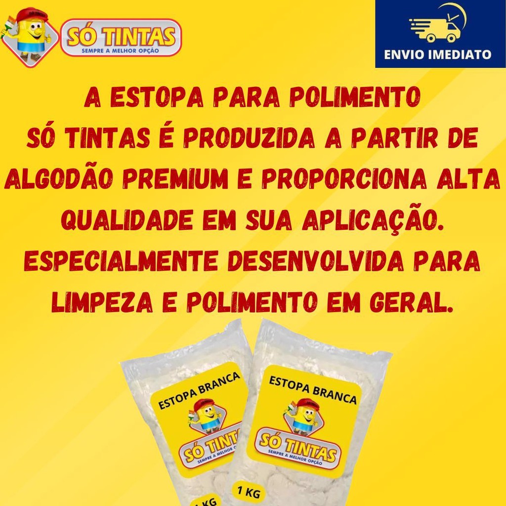 • Limpa e dá brilho: Pode ser usado para limpar e dar brilho em móveis de madeira, vidro, metal ou plástico além de evitar manchas.• Use com Produtos Químicos: Serve para aplicar produtos como ceras, polidores, produtos de limpeza e óleos e também ideal para limpeza de graxas e resíduos químicos.• Pintura: Serve para pintar e tirar tinta, e também para dar brilho em coisas já pintadas preservando a pintura e evitando manchas.• Limpa tudo: Pode ser usado para limpar ferramentas, equipamentos e outras coisas em casa ou no trabalho.Feito de 100% algodão, a Estopa Multiuso tem um alto poder de absorção e é conhecido por ser resistente, ajudando em várias tarefas de limpeza e brilho em casa, na oficina ou em qualquer lugar.- 6 Embalagens de 1 Kg.- Pronta para uso.Estopa Multiuso 1 KgLinha que ajuda bastante na limpeza e tem um preço bem acessível!Ótimo para limpar ferramentas de pintura, limpeza automotiva, limpeza de ferramentas manuais entre outros.PRINCIPAIS PERGUNTAS:Acompanha nota fiscal?Sim, todos os nossos produtos são enviados com nota fiscal.O envio é por Correios?Pode ser enviado por Correios ou por transportadora privada, isso vai depender da disponibilidade das transportadoras que atendem o seu endereço.SÓ TINTAS, SEMPRE A MELHOR OPÇÃOSomos a maior rede de lojas de tintas no estado do Rio de Janeiro.Desde 1977, a Só Tintas atua no Rio de Janeiro oferecendo os melhores produtos e soluções em pintura imobiliária, automotiva e industrial. Somos uma empresa familiar que começou em Teresópolis e hoje temos mais de 30 lojas físicas. Trabalhamos de forma ética e transparente, com o principal objetivo de proporcionar aos nossos clientes um atendimento de excelência, provendo as melhores soluções. Nossa missão é levar cor para a vida das pessoas. Por isso a Só Tintas é Sempre a Melhor Opção.