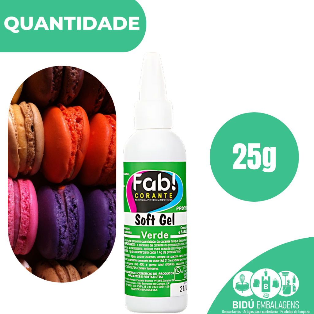 Corante Soft Gel Diversas Cores 25g FAB O Corante Soft Gel da Fab!É altamente concentrado, favorecendo um rendimento muito maior se comparado aos corantes líquidos e em gel, Desenvolvido para conferir cores vivas e intensas em coberturas aeradas do tipo creme (chantilly, glâces, chantininho e etc.) e pastas de açúcar ( pasta americana, pasta de feijão e etc). Sem fazer com que elas percam a estabilidade e tenham seu rendimento comprometido. Sua alta concentração faz com que as preparações cheguem mais rapidamente na tonalidade.Um receio que muitas confeiteiras tem é que o corante amargue, o corante da Fab! não amarga, e o melhor de tudo é que ele tem uma ótima pigmentação e um alto rendimento. Sua embalagem permite uma aplicação prática e fácil, as confeiteiras amam e com razão. Dosagem Orientativa: 5g por kg de produto final. Necessário deixar as preparações em descanso por aproximadamente 5 minutos para que, somente após este tempo, corrija-se os tons, pois as cores se intensificam com o passar do tempo. Ingredientes: Água, açucar invertido, xarope de glucose, amido modificado, sal, corantes artificiais, conservantes, espessantes, acidulante ácido cítrico. NÃO CONTÉM GLUTÉN. CONTÉM TARTRAZINA. Conservar em local seco e fresco. Cores: Rosa Candy, Azul Candy, Lilás Candy, Laranja Candy,Verde Candy e Amarelo Candy.