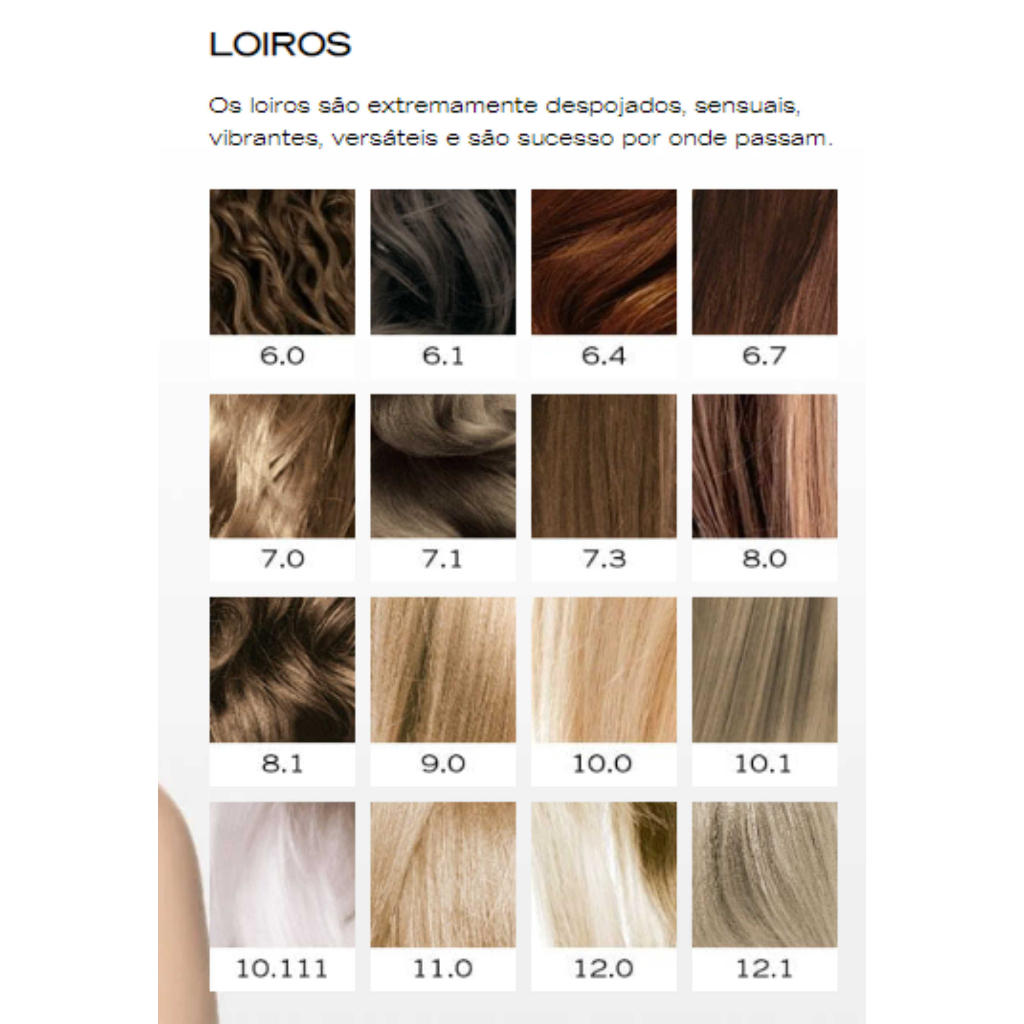 ECONOMIZE!! NO COMBO A UNIDADE SAI A R$8,52 IMPORTANTE!!!!!!! A escolha das quantidades e tonalidades devem ser enviadas no chat, junto ao ID do pedido ou colocadas na observação do pedido. Não esqueça!!!! CASO O CLIENTE NÃO ESPECIFIQUE AS CORES QUE DESEJA SERÁ ENVIADO CONFORME A DISPONIBILIDADE EM ESTOQUE **TONALIDADES DISPONÍVEIS** 7.0 LOIRO MEDIO 9.98 MAGENTA 10.1 LOIRO CLAR. CIZENTADO 6.7 LOIRO ESCURO MARROM 6.66 LOIRO ESCURO VER. INTENSO 6.0 LOIRO ESCURO 1.11 PRETO AZULADO **ESGOTADO** 3.66 ACAJU PURPURA 8.43 LOIRO CLARO ACOBREA. DOURADO 4.66 CAST. MEDIO VIOLETA INTENSO 2.1 PRETO ESPECIAL 8.4 LOIRO CLARO ACOBREA. 1.77 PRETO AZULADO INTENSO 12.0 LOIRO ESPECIAL 6.4 LOIRO ESCURO ACOBREA. 5.26 MARSALA ESCURO 1.0 PRETO INTENSO 4.0 CASTANHO MEDIO 6.1 LOIRO ESCURO ACIZENTADO 7.4 LOIRO ACOBREA. 12.1 LOIRO CINZA ESPECIAL 11.0 LOIRO MUITO CLARO 5.5 ACAJU 1.88 PRETO TABAC 8.1 LOIRO CLARO ACINZENTADO 8.0 LOIRO CLARO 7.3 LOIRO MEDIO DOURADO 7.66 LOIRO MEDIO VERM. INTENSO 2.8 PRETO AZULADO PERÔLADO 5.0 CASTANHO CLARO 1.110 PRETO INTENSO PROFUNDO 2.0 PRETO 10.111 LOIRO CINZA CLARISSÍMO SUPER INTENSO ***esgotado*** 1.7+ PRETO ESPECIAL 1.01 PRETO CARV 7.1 LOIRO MEDIO ACINZENTADO 5.74 CHOCOLATE ACOBREA. 9.0 LOIRO ULTRA CLARO 1.2 PRETO AMETISTA 3.0 CASTANHO ESCURO 10.0 LOIRO CLARISSIMO 6.88 MARROM TABAC 8.26 MARSALA 4.7 CAST. MEDIO MARROM INTENSO 10.111 **ESGOTADO**