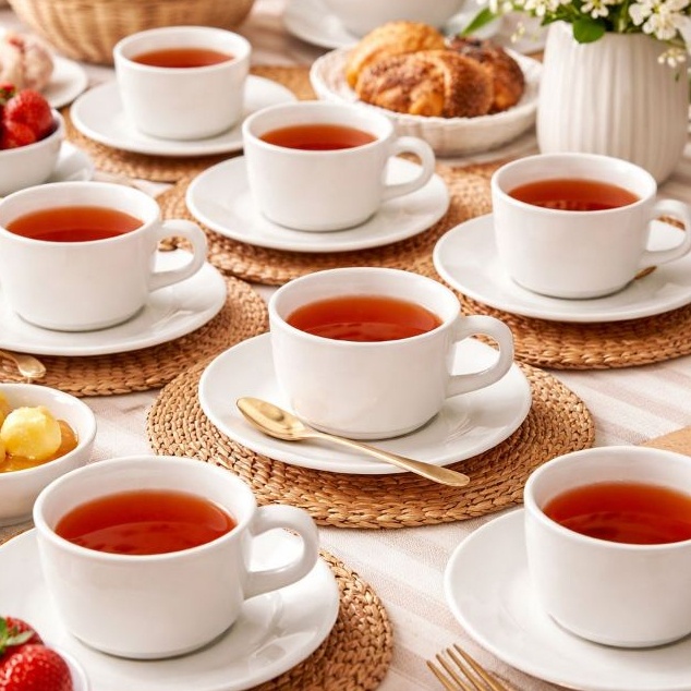 Kit 6 xícaras e pires para chá, em plástico resistente para uso domestico, bares, barcos, cafeterias