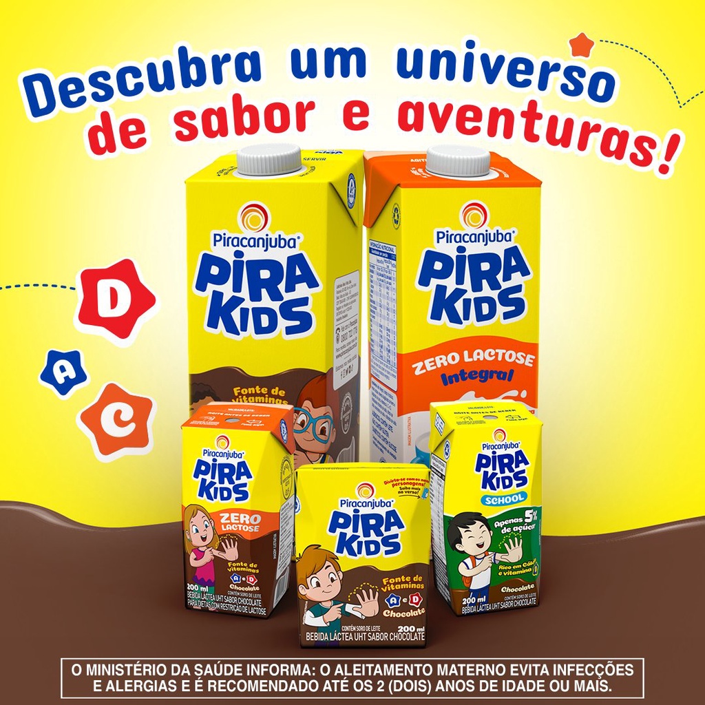 Bebida Láctea Pirakids 200ml Piracanjuba - Kit com 60 unidades. Bebida Láctea UHT Piracanjuba Pira Kids Chocolate 200 ml A Bebida Láctea UHT Piracanjuba Pira Kids Chocolate 200 ml foi desenvolvida especialmente para o público infantil, combinando sabor, nutrição e praticidade. Com fórmula atualizada e textura cremosa, ela entrega o sabor de chocolate que as crianças adoram, enquanto fornece vitaminas importantes para o crescimento e o dia a dia. A embalagem de 200 ml é ideal para lancheiras, passeios, escolas e consumo imediato, oferecendo praticidade e segurança com porção individual. Destaques do Produto Sabor: Chocolate Categoria: Bebida láctea UHT Volume: 200 ml (porção individual) Fonte de Vitaminas A e D Contém soro de leite Fórmula pensada para crianças Pronto para beber Ingredientes Soro de leite, soro de leite em pó reconstituído, leite integral, leite em pó integral reconstituído, água, açúcar, creme de leite, cacau, amido modificado, cloreto de sódio, vitamina A, vitamina D, espessantes (goma guar, goma arábica, carboximetilcelulose sódica, goma xantana), aromatizantes e estabilizantes (fosfato trissódico, tripolifosfato de sódio e citrato de sódio). Alergênicos Contém leite e derivados. Contém lactose. Não contém glúten. Armazenamento e Conservação Conservar em local seco e arejado. Não requer refrigeração antes de abrir Após aberto, manter refrigerado entre 1°C e 10°C e consumir em até 48 horas. Servir gelado para melhor experiência.