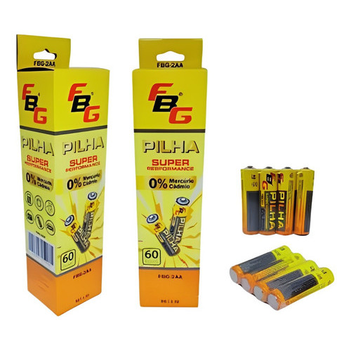PILHA COMUM AA PEQUENA CAIXA 60 PEÇAS BLISTER DE 4 EM 4 PEÇAS TENSÃO:1,5V MODELO TAMANHO: AA PEQUENA COMUM MARCA: FBG LIVRE DE CADMIO E MERCURIO, IMPORTANTE DO CASO DE DESCARTE OTIMA UTILIZAÇÃO EM BRINQUEDOS, CONTROLES, RELOGIOS, ETC.. PARA QUEM TEM ALTA DEMANDA OTIMO CUSTO X BENEFICIO.