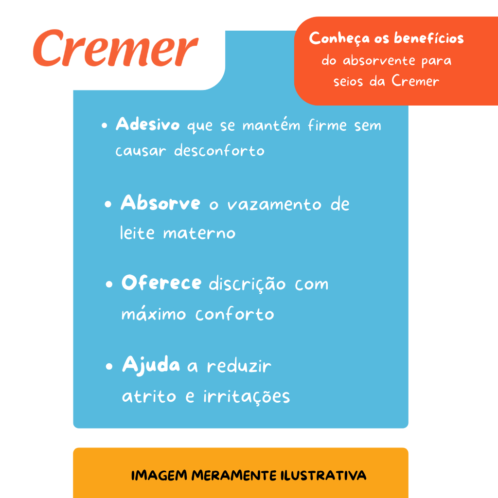 Kit com 02 caixas de absorvente para seios Cremer com 30 unidades Cada. - Total de 60 unidades - - Não Reutilizável - - ESPECIFICAÇÕES - - Gel superabsorvente - Canais antivazamentos - Curvatura anatômica e confortável - Duas fitas adesivas que aderem ao sutiã - Testado dermatologicamente - Não Reutilizável - Descartavéis - O Absorvente para Seios Cremer foi desenvolvido especialmente para a praticidade e o conforto das mamães que estão em processo de amamentação. Possuem gel superabsorvente onde o adesivo fixador adere ao sutiã, prevenindo desconfortos ou irritação, que proporciona toque macio e suave, além de conforto e segurança – absorção rápida que evita possíveis manchas. - O Absorvente para Seios conta com 6 canais que facilitam a distribuição homogênea do leite mantendo a região seca. - Produzido em formato anatômico, que se acomoda confortavelmente no seio, vem com fita adesiva para fixação discreta no sutiã, de modo que não marque a roupa.
