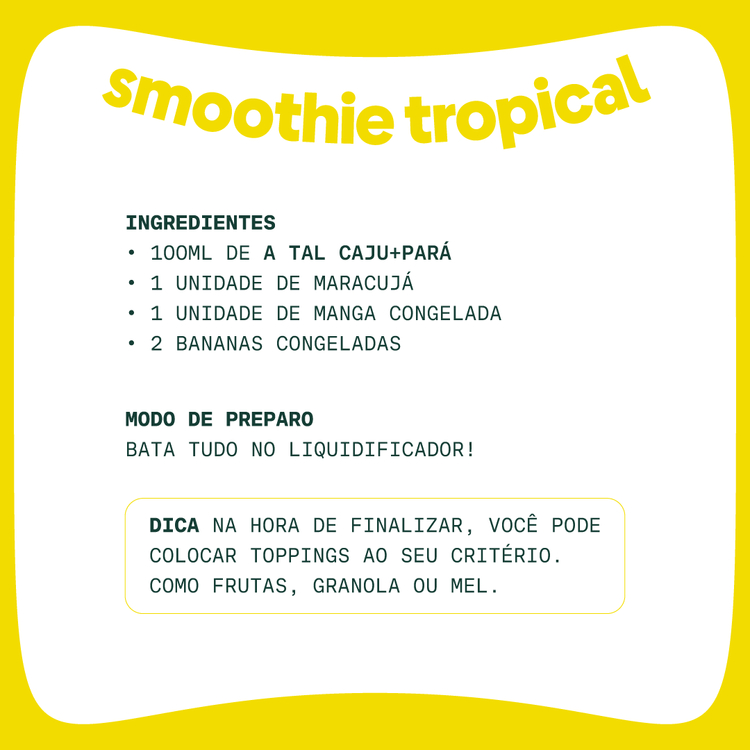 Bebida Caju + Pará Orgânico 1L – Sustentável e Natural Descrição: Descubra a harmonia perfeita de sabor e sustentabilidade com a Bebida Vegetal Caju + Pará Orgânico 1L. Feita com ingredientes orgânicos e certificada pelos Orgânicos do Brasil, esta bebida combina os benefícios nutricionais da castanha de caju e do Pará em uma fórmula simples e natural. Diferenciais do produto: Sustentável: Ingredientes provenientes de fazendas gerenciadas de forma responsável. Bem-estar animal: Compromisso com padrões elevados de cuidado e condições de vida. Certificado orgânico: Livre de conservantes, gomas e aditivos. Ingredientes: Água, farinha de castanha de caju orgânica, pasta de castanha do Pará. Como usar? Ideal para substituir o leite em café, receitas ou ser consumido puro. Mantenha em local seco e arejado. Após aberto, conserve sob refrigeração entre 1°C e 10°C e consuma em até 5 dias. Por que escolher? A Bebida Caju + Pará Orgânico é perfeita para quem busca sabor, nutrição e um consumo consciente, respeitando o meio ambiente e promovendo práticas responsáveis. Transforme sua rotina com saúde e sustentabilidade