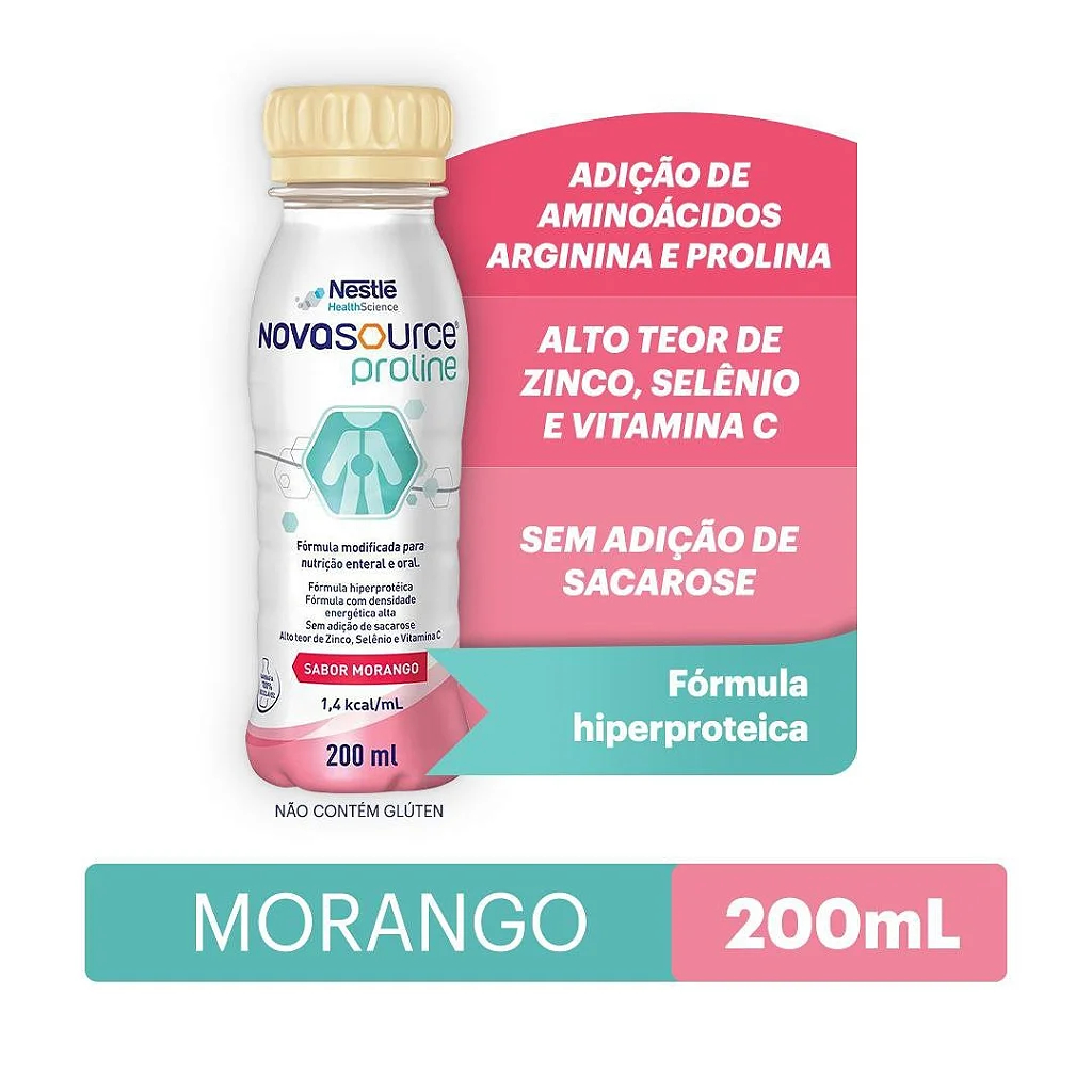 Novasource® Proline Morango 200ml é recomendado para nutrição de pessoas que enfrentam dificuldade na cicatrização, tais como lesões por pressão e lesões crônicas (pé diabético, radiodermite, feridas cirúrgicas e que no geral demoram mais de 4 semanas para cicatrizar), entre outras situações. Sua fórmula contém importantes nutrientes, incluindo o aminoácido prolina, um elemento essencial na composição do colágeno, que desempenha um papel vital na construção da integridade dos tecidos e contribui para a recuperação de feridas, úlceras e queimaduras. Além disso, o produto também contém arginina, que desempenha um papel importante no processo de cicatrização, ao atuar como um coadjuvante na síntese proteica e na proliferação celular. Com seu alto teor de proteína, arginina e prolina, juntamente com minerais como zinco e selênio, bem como as vitaminas A, E e C, o consumo de Novasource® Proline pode contribuir de maneira significativa para o processo de cicatrização em pessoas que sofrem de lesões por pressão, lesões crônicas, pé diabético, entre outras condições similares. Um grande diferencial do produto é não ter sacarose, outro fator diretamente relacionado ao bom processo cicatricial. Indicações do Novasource® Proline Novasource® Proline é indicado para idosos, adultos e crianças a partir dos 10 anos de idade. Conforme mencionado anteriormente, conta com arginina e prolina, além de alto teor de zinco, selênio, vitaminas A, C e E em sua composição, nutrientes que contribuem para um bom processo cicatricial. É um produto para nutrição enteral e oral, sem adição de sacarose. A regeneração da pele é um processo que requer uma variedade de nutrientes do corpo para ocorrer de maneira ideal. Em casos de desnutrição, nos quais ocorre a perda de massa muscular, é fundamental garantir uma ingestão adequada de calorias e proteínas para compensar essa deficiência e contribuir para o processo de cicatrização. A qualidade e a quantidade das proteínas oferecidas, impactam diretamente na produção de colágeno que tem um papel importante na construção, regeneração e integridade da pele. Portanto, é interessante enriquecer a dieta com aminoácidos que estimulam a síntese dessa proteína, como a arginina e prolina.