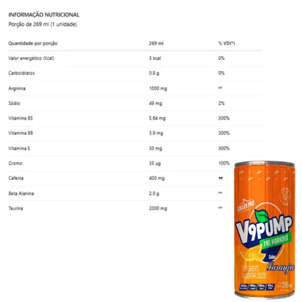 O V9 Pump da Shark Pro é uma excelente opção para quem busca mais energia, foco e desempenho nos treinos. Com uma fórmula potente e equilibrada, oferece praticidade e ação rápida, sendo ideal para atletas e praticantes de atividade física que desejam potencializar seus resultados. ------------------------------- COMO CONSUMIR ------------------------------ Consumir 1 unidade (269ml) cerca de 30 minutos antes do treino ou conforme recomendação de nutricionista ou médico. --------------------- BENEFÍCIOS --------------------- 2000 mg de beta-alanina por dose, contribuindo para o aumento da resistência muscular; 1000 mg de L-arginina, que auxilia na vasodilatação e melhora o fluxo sanguíneo; 2000 mg de taurina, importante para a contração muscular e função neuromuscular; 400 mg de cafeína, estimulante que promove energia, foco e disposição; Fórmula líquida de rápida absorção; Produto pronto para consumo, ideal para o dia a dia agitado; -------------------- ALÉRGICOS ------------------- Não contém glúten. Pode conter traços de derivados de leite, soja e ovos. --------------------------- INGREDIENTES --------------------------- Água, beta-alanina, L-arginina, taurina, cafeína anidra, acidulante ácido cítrico, aroma idêntico ao natural de cola, conservadores benzoato de sódio e sorbato de potássio, edulcorantes sucralose e acessulfame de potássio, corante caramelo IV.