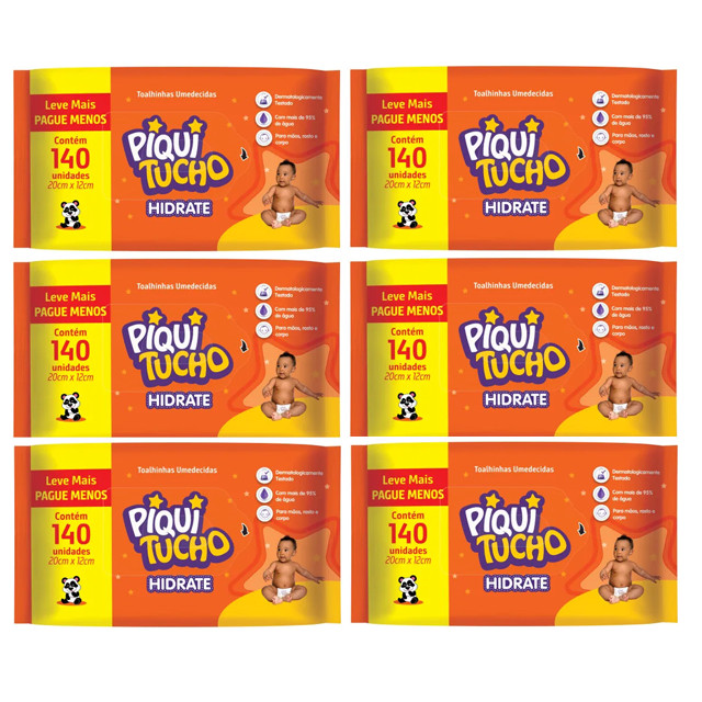 | Kit 6x Toalha Umedecida Hidrate Piquitucho C/ 140 Un este produto | R$ 68,00 | — | 5.0/5 | 50 |