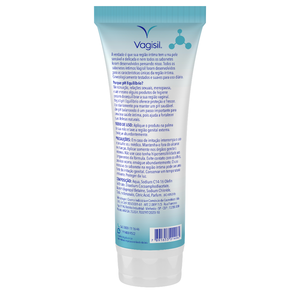 A verdade é que sua região íntima tem uma pele sensível e delicada e nem todos os sabonetes foram desenvolvidos pensando nisso. Todos os sabonetes íntimos Vagisil foram desenvolvidos para as características únicas da região íntima. Ginecologicamente testados e suaves para uso diário. Vagisil pH Equilíbrio oferece proteção e frescor. Use diariamente para manter um pH saudável. Um pH balanceado é um passo importante para uma boa saúde íntima, pois ajuda a fortalecer suas defesas naturais. Modo de uso: Aplique o produto na palma de sua mão e lave a região genital externa. Enxágue abundantemente. Precauções: Em caso de irritação interrompa o uso e consulte seu médico. Mantenha-o fora do alcance de crianças. Aplicar somente nos órgãos genitais externos. Não use caso tenha hipersensibilidade aos componentes da fórmula. Evite contato com os olhos, caso isso ocorra, enxágue abundantemente. O uso excessivo de sabonete na região íntima pode ser uma fonte de irritação genital. Conservar em temperatura ambiente. Proteger da luz.