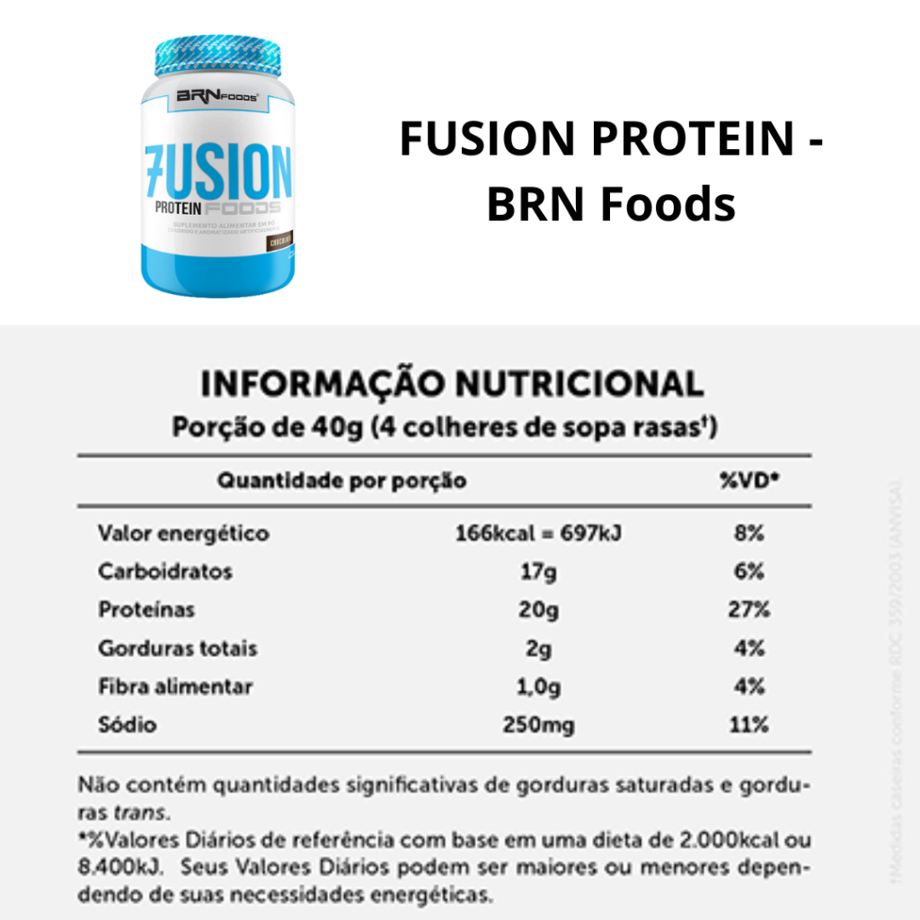 Whey Protein Concentrado Fusion Protein Foods 900g - BRN Foods 💪 Principais Vantagens: 🏋️♂️ Diversidade Proteica 🌱 20g de Proteína por Dose 🥩 Baixa em Gorduras e Carboidratos 🚀 Aliado no Desenvolvimento Muscular 📈 Suplementação Perfeita ✅ Recomendações de Uso: Adicionar 40 g (4 colheres de sopa rasas) em 300 mL (1 ½ copo) de água. Bater no liquidificador ou coqueteleira por 20 segundos e consumir imediatamente após o preparo.