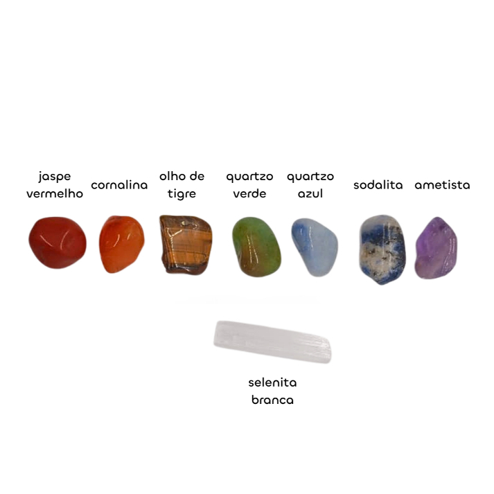 Kit 7 Chakras Pedra Rolada Pequenas + Saco Algodão + Selenita Branca 8 Cristais Mini Kit Les Energie