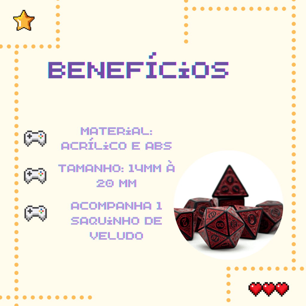 Deixe suas aventuras ainda mais épicas com este incrível Kit de 7 Dados RPG com marcas rúnicas na cor vermelha. Produzidos em acrílico e ABS de alta qualidade, os dados oferecem excelente durabilidade, ótima rolagem e acabamento detalhado. Ideal para partidas de RPG de mesa e jogos de tabuleiro, é o conjunto perfeito para complementar sua experiência e trazer mais estilo à sua mesa. Produto disponível para pronta entrega, enviado com embalagem segura e nota fiscal. 📦 O QUE VOCÊ IRÁ RECEBER? 01 D4 01 D6 01 D8 01 D10 01 D10% 01 D12 01 D20 01 Bolsa de veludo preta para armazenamento 🌟 BENEFÍCIOS ALTA DURABILIDADE E RESISTÊNCIA DESIGN EXCLUSIVO COM MARCAS RÚNICAS ROLAGEM PRECISA E EQUILIBRADA ACOMPANHAMENTO DE BOLSA PARA PROTEÇÃO E ORGANIZAÇÃO ENVIO RÁPIDO E EMBALAGEM SEGURA 🔎 CARACTERÍSTICAS DO PRODUTO Cor: Vermelho Material: Acrílico e ABS Tamanho aproximado: 14mm a 20mm Contém 07 peças no conjunto ❓ PERGUNTAS FREQUENTES Tem pronta entrega? Sim, todos os produtos estão disponíveis para envio imediato. Quando será enviado? Após a confirmação do pagamento, o envio é realizado em até 24 horas úteis. Acompanha nota fiscal? Sim, o produto é enviado com nota fiscal. E se houver algum problema com o produto? Oferecemos garantia contra defeitos de fabricação e suporte pós-venda. Caso necessário, você pode solicitar devolução conforme as regras da plataforma. Compre com segurança e leve mais estilo para suas partidas! 🎲 palavras-chave: rpg, dados, d20, dungeons and dragons, poliédral, mesa, tabuleiro