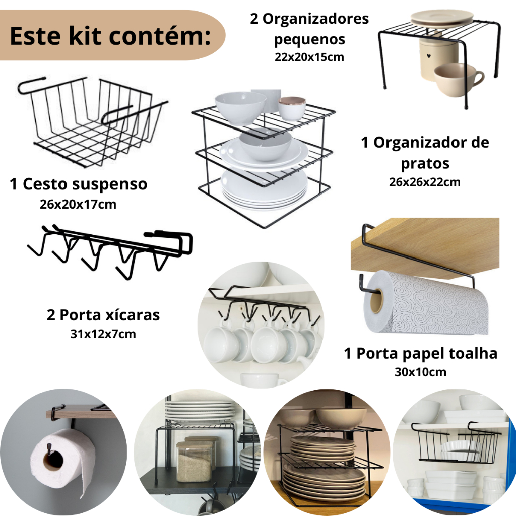 Está precisando de mais espaço nos seus armários da cozinha? Montamos um kit com tudo que você precisa para ocupar todos os cantinhos dele até a parte superior das prateleiras e aproveitar todo o espaço. Utilize os organizadores para guardar os pratos, potes, xícaras, louças, para despensa ou até como fruteira. O kit contém: - 2 Organizadores de armário prateleira pequeno (22x20x15cm) - 1 Cesto Suspenso (27x20x12,5cm) - 1 Suporte para Papel Toalha (30x0,6x10,6cm). - 1 Suporte Quadrado de Pratos (26x26x22cm) - 2 Porta Xícaras (31x12x7cm) Características: - Nenhum dos organizadores precisa ser parafusado, todos são encaixados. - Material: Aço carbono e pintura epóxi.