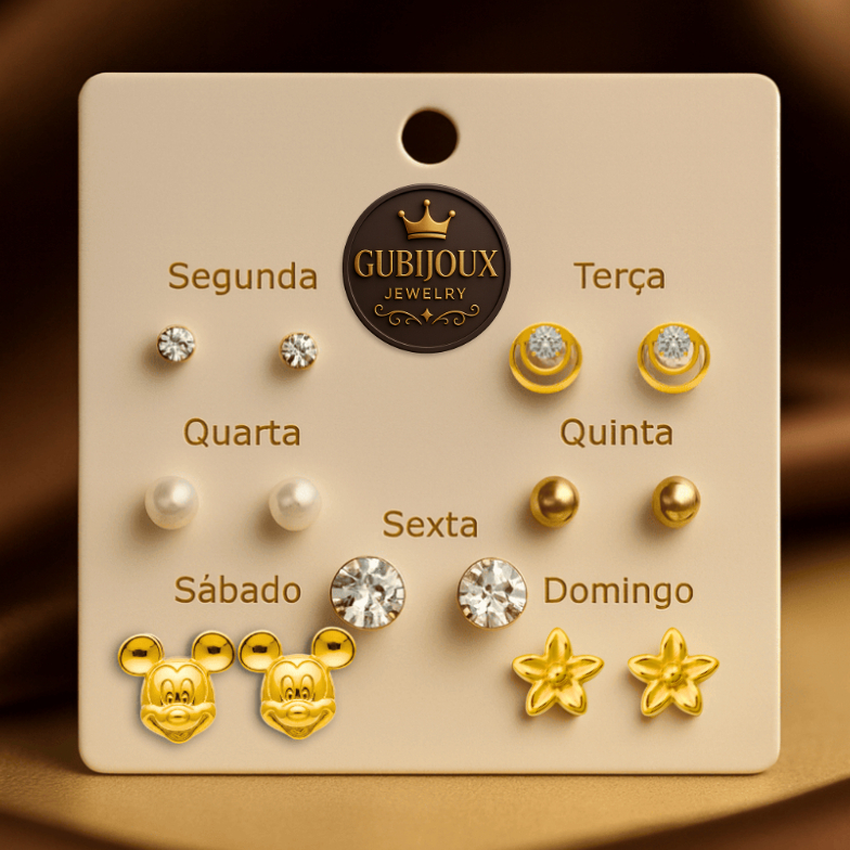 Kit 7 Pares Brincos Semana Inteira Dourados Fofo Coração Pérola | Look Completo