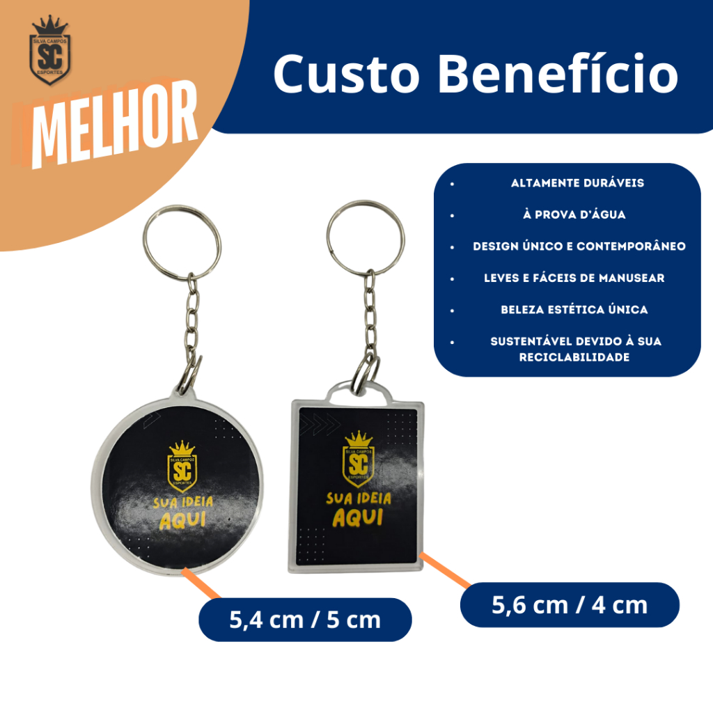 Chaveiros Personalizados Design Personalizado: Transforme sua ideia em um chaveiro exclusivo, seja no formato circular ou quadrado. Acabamento Premium: Adesivado e resinado, garantindo durabilidade e um acabamento brilhante. Criação de Arte: Sem ideia pronta? Nossa equipe de designers cria a arte para você, sem custo adicional. Resistência e Durabilidade: O adesivo e a resina protegem contra desgastes, garantindo que o chaveiro mantenha sua aparência original por muito tempo. Fácil Personalização: Basta enviar sua ideia ou deixar que nossos designers criem algo exclusivo para você, facilitando o processo. Opções de Compra Econômicas: Kits de 5, 10, 20, 30, 40 e 50 unidades, permitindo flexibilidade para atender suas necessidades e orçamento. Garanta chaveiros únicos e de alta qualidade, feitos especialmente para você!