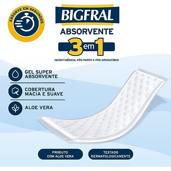 O Kit contém: 8 pacotes de Absorventes Geriátricos Bigfral Regular Plus 20un cada. O Absorvente Bigfral 3 em 1 foi desenvolvido para incontinência leve a moderada. Absorve em segundos e possui uma cobertura macia e suave com aloe vera.