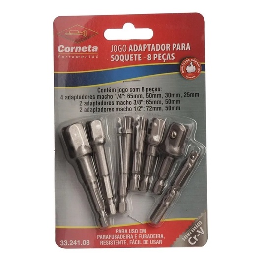 Kit 8 Adaptador Soquete Parafusadeira Furadeira 1/4 3/8 1/2 - Material: Aço Cromo Vanádio - Cor: Prata - Marca: Corneta - Composição: • Encaixe:1/2" - 3/8" - 1/4" 1/4" x 65mm - 1/4" x 50mm 1/4" x 30mm - 1/4" x 25mm 3/8" x 65mm - 3/8" x 50mm 1/2" x 72mm - 1/2" x 50mm - Caracteristicas: • Jogo de Adaptador com encaixe ¼” para utilizar soquetes de encaixe de ½”, 3/8” e 1/4” em parafusadeira e furadeira; • Fabricado em aço cromo vanádio, de maior resistência; • Acabamento cromo acetinado. • Pode ser usado em furadeira/parafusadeira com ou sem impacto;