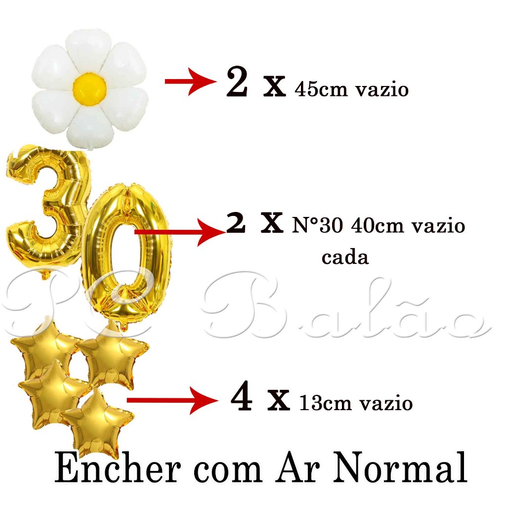 KIT VAI: 2 Flor MARGARIDA 45CM + IDADE 30 DOURADO 40cm DOURADO + 4 Estrela 13cm DOURADA JARDIM ENCHE COM AR NORMAL COM AJUDA BOMBA DE ENCHER BEXIGA OU COM A PONTA DO CANUDO COMUM IPode ser enchido com bomba de balão, bomba de encher pneu de bicicleta, pode encher com canudo Comum. Possui válvula, e deve ser cheio com bombas de inflar. (A válvula permite que após o enchimento não seja necessário que prenda a boca do balão com fita. Pois a válvula trava o ar automaticamente após o enchimento.)Atenção: Não acompanha nenhum tipo de fita, prendedor, suporte de balão, palito etc.Fotos meramente ilustrativas. (Apenas sugestões de como usar.)