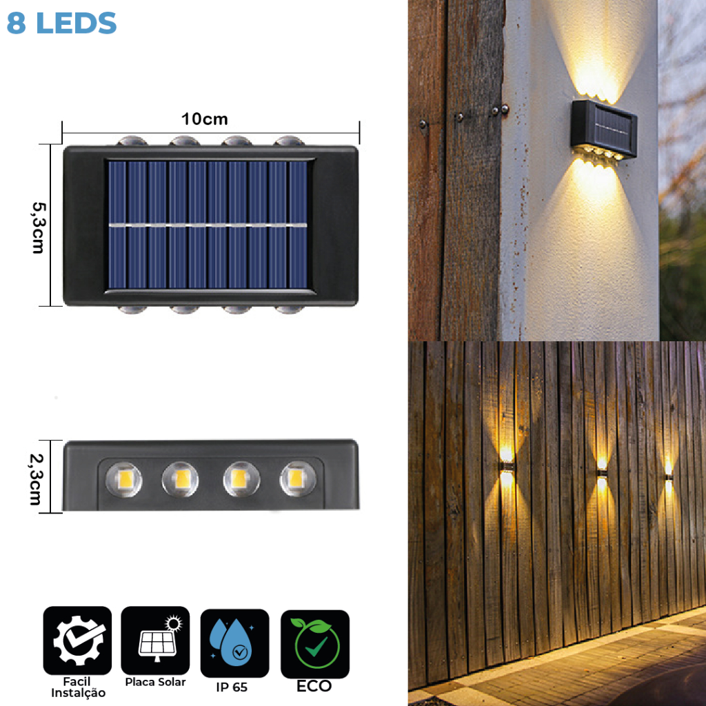 Kit 8 Luminária Arandela Solar 8 LED Luz Branco Quente para Parede a Prova dágua Spot para parede