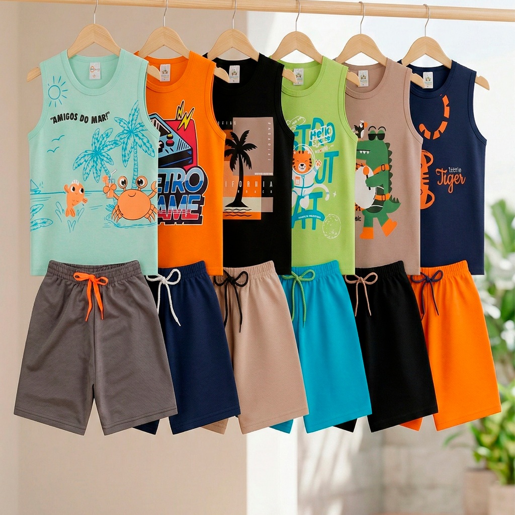 Kit com 4 Conjuntos SORTIDOS - Kit 8 Peças sendo 4 Regatas + 4 Bermudas. *Recomendação de tamanhos* Tamanho 1 - Veste de 6 a 12 meses Tamanho 2 - Veste 1 ano Tamanho 3 - Veste 2 anos Tamanho 4 - Veste 3 anos Tamanho 6 - Veste 4/5 anos Tamanho 8 - Veste 6/7 anos Tamanho 10 - Veste 8/9 anos A camiseta é confeccionada em meia malha 100% algodão, gola redonda com reforço. A bermuda é feita em moletinho 100% algodão, elástico confortável na cintura. O conjunto é fabricado essencialmente com algodão em suas composições, garantindo resistência, maciez e conforto. É ideal para dias mais quentes, passeios e momentos de lazer, além de versátil e prático. Não perca essa oportunidade de lançamento na Polo Infantil Store e garanta seu Kit conjunto agora mesmo. KIT COM 4 CONJUNTOS (4 Bermudas + 4 Regatas) Os tamanhos recomendados acima podem variar de acordo com o biotipo/tamanho de cada criança. Por isso, recomendamos também conferir a tabela de medidas. * ATENÇÃO ENVIAREMOS MODELOS VARIADOS CONFORME DISPONIBILIDADE EM ESTOQUE * NÃO TEM OPÇÃO DE ESCOLHA * CONFIRA A TABELA DE MEDIDAS PARA SABER O TAMANHO IDEAL * TAMANHO DO CONJUNTO NÃO QUER DIZER A IDADE DA CRIANÇA * CAMISETA 100% ALGODÃO * BERMUDA MOLETINHO 85% ALGODÃO *PARA ATÉ DOIS KIT DO MESMO TAMANHO, GARANTIMOS QUE NÃO VAI REPETIDO. PARA MAIS KITS ADQUIRIDOS DO MESMO TAMANHO PODE REPETIR COR OU ESTAMPA*