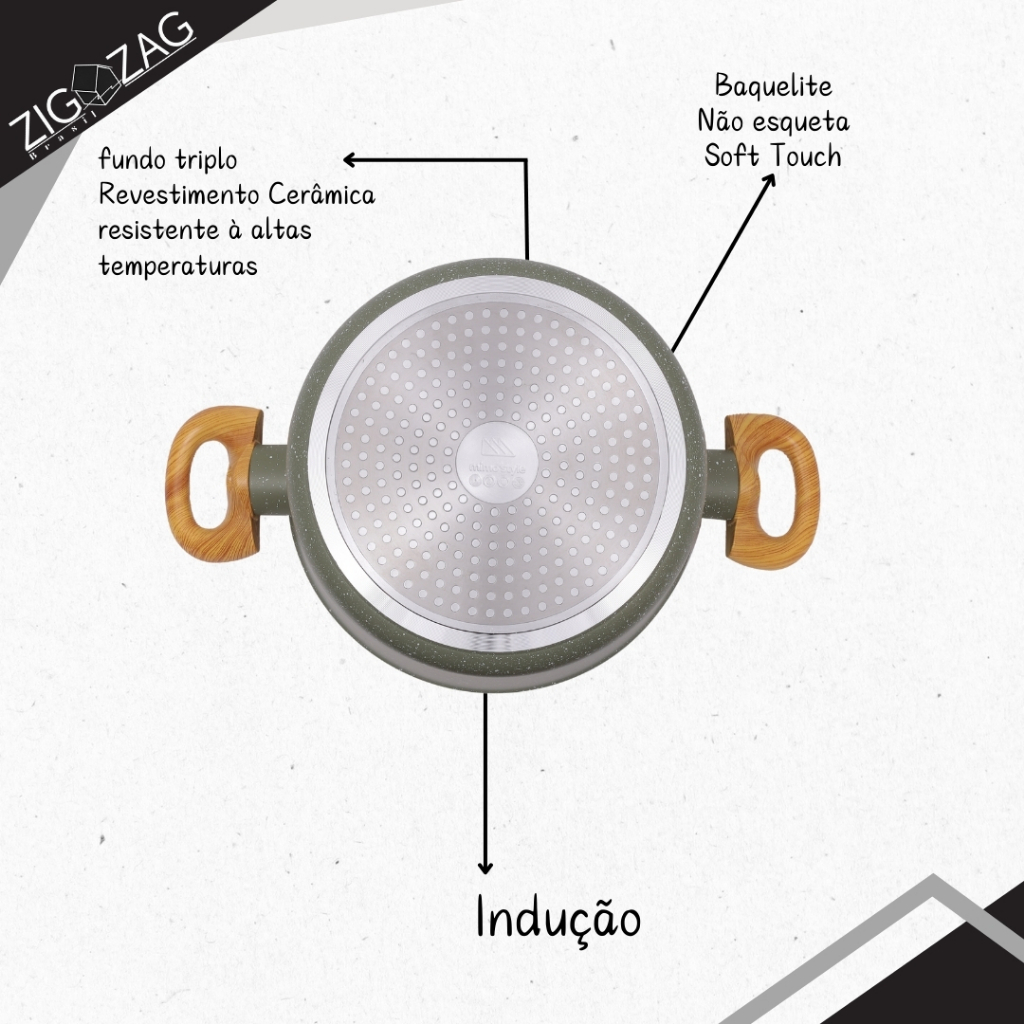 Recomendação da Loja O Conjunto de Panelas com 8 Peças Style Cook Quartzo é composto por itens essenciais para uma cozinha completa e prática. Com revestimento cerâmico de 3 camadas, proporciona cozimento uniforme, rápida condução de calor e economia de energia. É compatível com fogões de indução, a gás e vitrocerâmico, oferecendo versatilidade no preparo dos mais variados pratos. O fundo triplo garante maior durabilidade e eficiência. Os cabos com revestimento Soft-Touch proporcionam conforto e segurança durante o manuseio. O conjunto apresenta um acabamento elegante e funcional, ideal para todos os estilos de cozinha. Especificações: Material: Alumínio com Revestimento Cerâmico e Soft-Touch Revestimento: 3 camadas (2 antiaderentes + 1 resistente a alta temperatura) Fundo: Triplo Peças e tamanhos: Frigideira: 22 x 4,7 cm - 1,45 L | Peso: 500 g Frigideira: 16 x 4 cm - 0,6 L | Peso: 330 g Caçarola: 22 x 10 cm - 3,2 L | Peso: 1.300 g Caçarola: 18 x 8,5 cm - 1,7 L | Peso: 950 g Panela: 16 x 8,5 cm - 1,7 L | Peso: 920 g Panela: 16 x 8,5 cm - 1,3 L | Peso: 730 g Leiteira: 14 x 12 cm - 1,8 L | Peso: 410 g Grill: 24 x 4 cm - 1,5 L | Peso: 670 g Cores: Quartzo/Esmeralda Muito obrigado por escolher a Zig Zag!