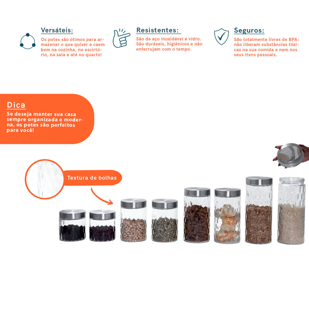 Kit 8 pote de vidro com tampa inox bolhas redondo 800ml, 1300ml, 1700ml e 2200ml - Mozcada