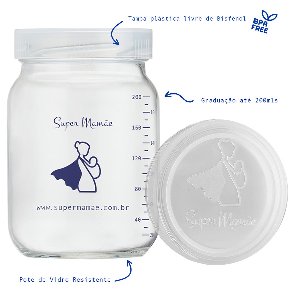💕 Pote de Vidro para armazenar leite materno — Seguro, Sustentável e Feito com Amor 💛 Mantenha o leite materno protegido e pronto para o seu bebê com os potes para armazenar leite materno da SUPER MAMÃE. Feito pra quem quer continuar oferecendo o melhor, mesmo de longe. 💎 Características que fazem a diferença: ✅ Nosso pote é de vidro — reutilizável, resistente, higiênico. ✅ Tampa livre de BPA — Segurança total para o seu bebê. ✅ Graduação permanente no vidro — Não apaga com o tempo ou lavagens. ✅ Pote e tampa podem ir na lava-louças — Mais praticidade no seu dia a dia. ✅ Capacidade ideal — Armazene até 200ml em cada pote ✅ Versátil: Além do leite materno, os potes da SUPER MAMÃE servem para armazenar outros tipos de alimentos. Com design compacto e fácil de limpar, o pote da SUPER MAMÃE é o companheiro ideal na rotina de extração e armazenamento do leite materno. Feito de vidro, que ajuda a conservar melhor os nutrientes, mantendo o alimento do seu bebê seguro e cheio de vida. 💕Feito para mães reais, com necessidades reais 💕 Garanta o seu e tenha mais tranquilidade na sua jornada de amamentação. ⚠️🔔 Atenção! Este anúncio se refere a um conjunto com 08 potes 🔔⚠️ Ficha técnica do pote: -Capacidade útil: 200ml -Capacidade total: 267ml -Altura: 100mm -Diâmetro: 68mm -Diâmetro do bocal: 55mm Informações sobre a graduação: - Gravação fundida ao vidro (não sai com o tempo) - Marcação inicial: 20ml - Marcação final: 200ml - Divisão: 10ml - Variação: 10% (Pode apresentar variação de 10% do valor da medição para mais ou para menos)